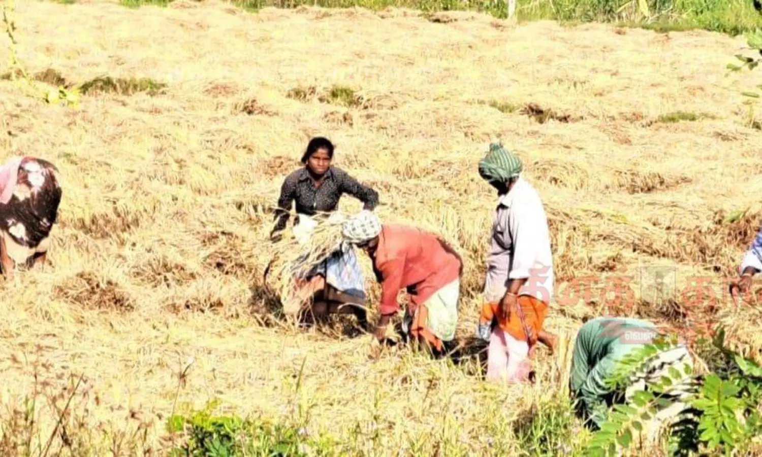 எந்திரங்களுக்கு பதிலாக ஆட்கள் மூலம் சம்பா நெல் அறுவடை
