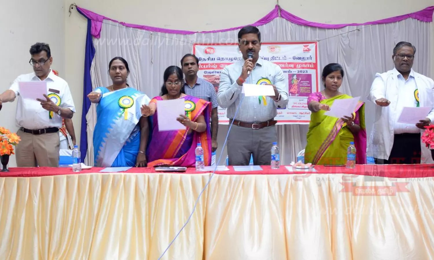 வேலூர் டவுன் ஹாலில் தொழுநோய் விழிப்புணர்வு முகாம் மற்றும் உறுதிமொழி ஏற்பு நிகழ்ச்சி நடந்தது. சுகாதாரப்பணிகள் துணை இயக்குனர் பானுமதி, குடும்ப நலத்துறை துணை இயக்குனர் மணிமேகலை, அடுக்கம்பாறை அரசு மருத்துவமனை தோல் சிகிச்சைப்பிரிவு தலைவர் டாக்டர் வரதமூர்த்தி ஆகியோர் முன்னிலை வகித்தனர்.