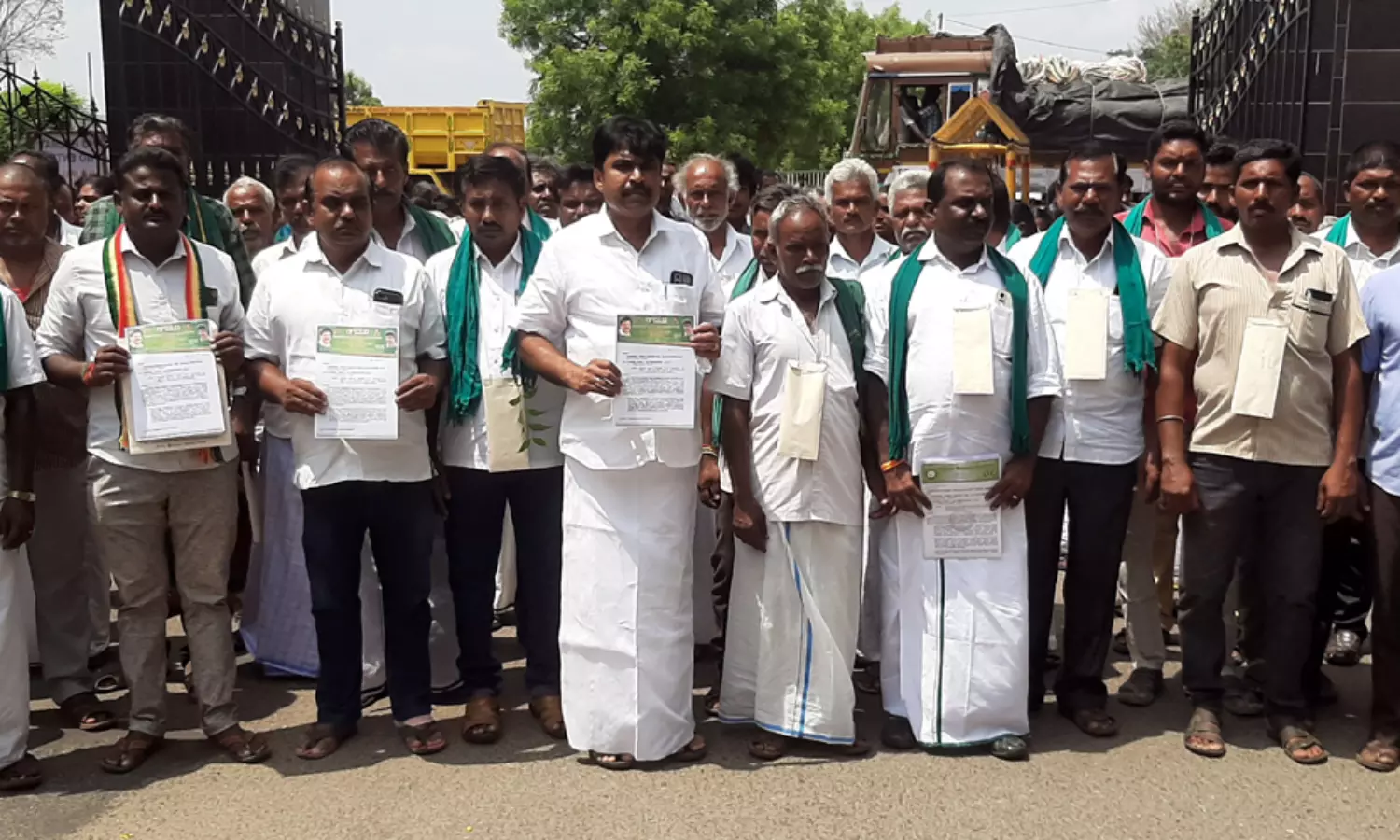 விவசாய முன்னேற்ற கழக பொதுச்செயலாளர் பாலசுப்ரமணியன் தலைமையில் கொ.ம.தே.க. மாவட்ட செயலாளர் மாதேஸ்வரன், விவசாய அணி செயலாளர் ரவிச்சந்திரன் மற்றும் விவசாயிகள், பொதுமக்கள் நேற்று மனுவை மாலையாக அணிந்தும், கழுத்தில் தொங்கவிட்டபடியும் வந்து, நாமக்கல் கலெக்டர் ஸ்ரேயாசிங்கிடம் கோரிக்கை மனு ஒன்றை அளித்தனர்.