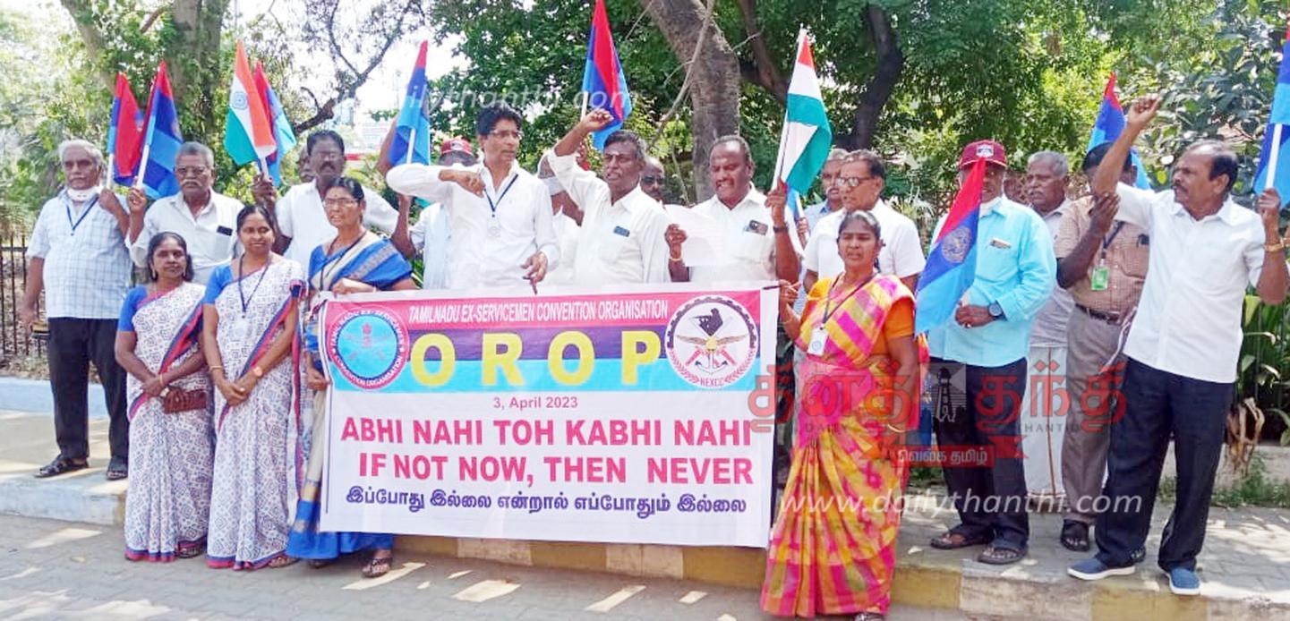 தமிழ்நாடு முன்னாள் படைவீரர் மாநாடு கூட்டமைப்பு தலைவர் பழனியப்பன் தலைமையில் அந்த அமைப்பினர் மனு கொடுப்பதற்காக வந்தனர். அப்போது அவர்கள் கலெக்டர் அலுவலக வளாகத்தில் ஆர்ப்பாட்டத்தில் ஈடுபட்டனர். அதன்பிறகு அவர்கள் கொடுத்த கோரிக்கை மனுவில், "ஒரு பதவி, ஒரு ஒய்வூதியம் என்ற அடிப்படையில் ஓய்வூதியம் வழங்க வேண்டும். ஓய்வூதியத்தில் உள்ள பாகுபாடுகளை சரி செய்ய வேண்டும். முன்னாள் படைவீரர்கள், முன்னாள் படைவீரர் விதவைகள் போன்றோருக்கு குறைக்கப்பட்ட ஓய்வூதியத்தை உயர்த்தி வழங்க வேண்டும்", என்று கூறப்பட்டு இருந்தது.