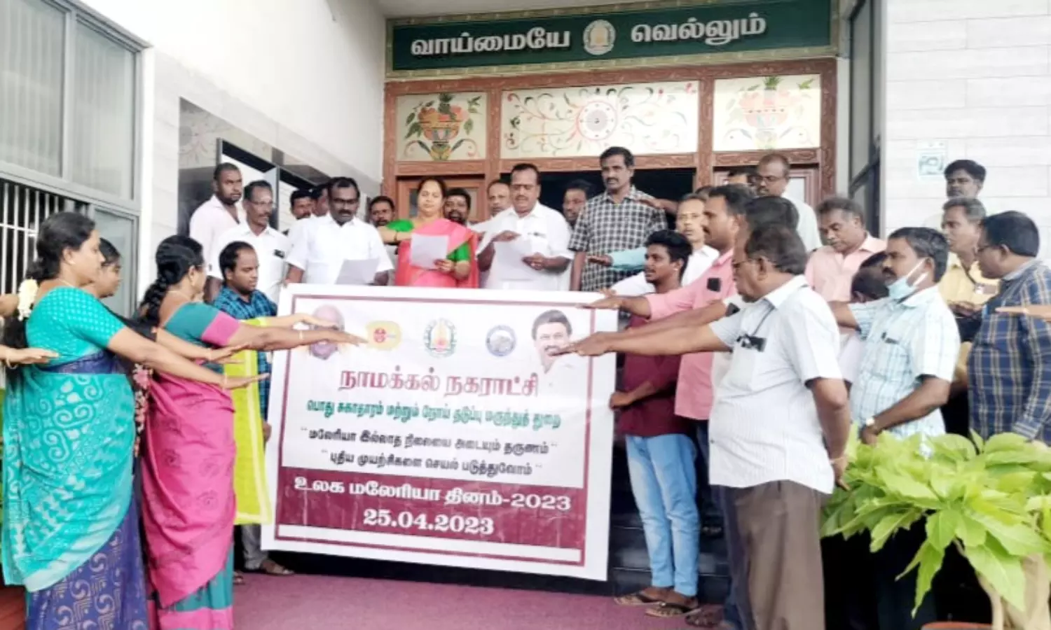உலக மலேரியா தினத்தையொட்டி நாமக்கல் நகராட்சி அலுவலகத்தில் உறுதிமொழி ஏற்கும் நிகழ்ச்சி நடந்தது. நகர்மன்ற தலைவர் கலாநிதி தலைமை தாங்கினார். நகராட்சி ஆணையாளர் சுதா முன்னிலை வகித்தார்.