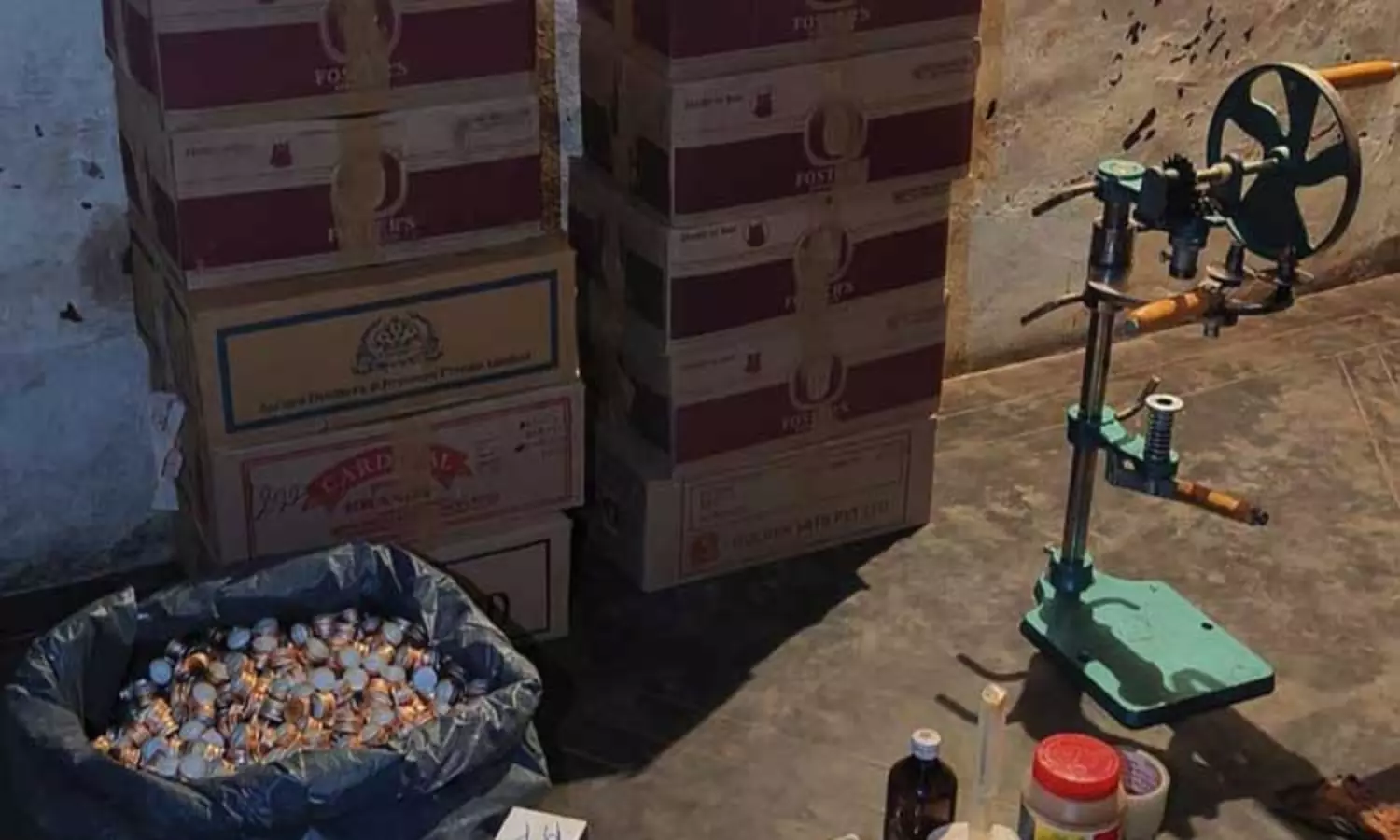 தொடர்ந்து போலீசார் அங்கு சென்று அதிரடி சோதனை நடத்தினர். அதில் 20-க்கும் மேற்பட்ட அட்டை பெட்டிகளில் தயார் செய்யப்பட்ட 454 போலி மது பாட்டில்கள் இருந்தது. மேலும் மதுபானம் தயாரிக்க பயன்படும் மூலப் பொருட்கள், பாட்டில் மூடிகள், பல்வேறு மதுபான நிறுவனங்களின் பெயர்கள் அச்சிடப்பட்ட போலி லேபிள்கள், மதுபானம் தயாரிக்கும் எந்திரங்கள் உள்ளிட்ட ஏராளமான பொருட்கள் இருந்தன.