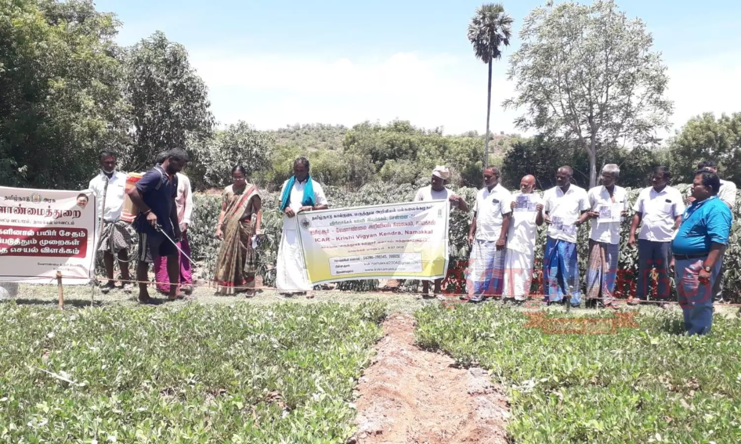 எருமப்பட்டி வட்டாரத்தில் உள்ள மேட்டுப்பட்டி கிராமத்தில் மயில்களால் பயிர்கள் சேதம் அடைவதை தடுப்பதற்கு வேளாண் அறிவியல் நிலையம் லத்துவாடி பூச்சியியல் வல்லுனர் விவசாயிகளுக்கு செயல் விளக்கம் செய்து காண்பித்தார். மேலும் இதுகுறித்து எருமப்பட்டி வேளாண்மை உதவி இயக்குனர் கவிதா கூறியதாவது:- எருமப்பட்டி வட்டாரத்தில் மயில்களால் பல்வேறு வேளாண்மை பயிர்கள் சேதம் அடைகின்றன. இவற்றை தடுப்பதற்கு ஹொர்போலிங் என்ற மூலிகை பூச்சி விரட்டி பயன்படுத்தி ஈச்ச வாரி கிராமத்திலும் விவசாயிகளுக்கு செயல் விளக்கம் செய்து காட்டப்பட்டது. இதை தெளிப்பதன் மூலம் மயில். காட்டு பன்றி, மான், முயல், எலி, காட்டுப் பறவைகள் அண்ட விடாமல் பயிர்களை பாதுகாப்பது மட்டுமல்லாமல் பயிர் வளர்ச்சி ஊக்கியாகவும் செயல்படுகிறது. இவ்வாறு அவர் கூறினார். இதில் வேலன் அறிவியல் நிலையம் புவியியல் வல்லுநர் முனைவர் சங்கர் கலந்துகொண்டு செயல் விளக்கம் செய்து காண்பித்தார். இதற்கான ஏற்பாடுகளை வேளாண்மை அலுவலர் பாபு, துணை வேளாண்மை அலுவலர் முரளிதரன் மற்றும் உதவி வேளாண்மை அலுவலர் முருகேசன் ஆகியோர் செய்திருந்தனர். இதில் ஏராளமான விவசாயிகள் மற்றும் பண்ணை மகளிர்கள் கலந்து கொண்டு பயன்பெற்றனர்.