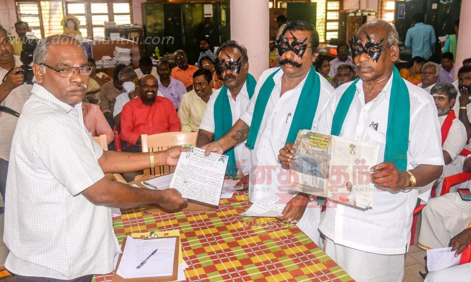 மூட்டைக்கு ரூ.50 வரை கட்டாய வசூல் செய்யப்படும் கொள்முதல் நிலையங்களில் முறைகேடுகளை தடுக்க வேண்டும் என குறைதீர்க்கும் கூட்டத்தில் முகமூடி அணிந்து விவசாயிகள் வலியுறுத்தினர்.