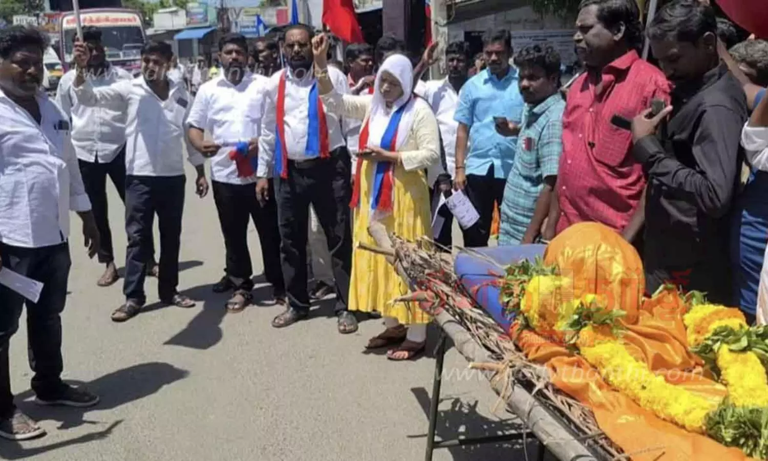 பாடைகட்டி தூக்கி வந்து விடுதலை சிறுத்தைகள் கட்சியினர் ஆர்ப்பாட்டம்