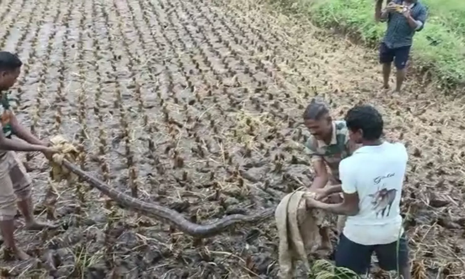 நெல்வயலில் 15 அடி நீள மலைப்பாம்பு சிக்கியது