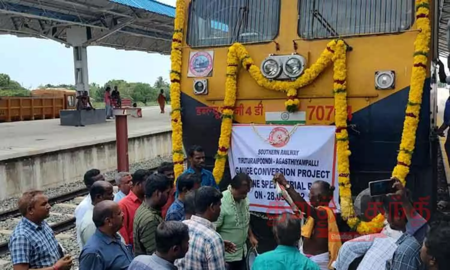 இந்த நிலையில் நேற்று மதியம் 1 மணிக்கு வேதாரண்யம் அருகே உள்ள அகஸ்தியன்பள்ளி ரெயில் நிலையத்தில் அதிவேக ரெயில் என்ஜின் சோதனை ஓட்டம் தொடங்கியது. முன்னதாக ரெயில் என்ஜினுக்கு மாலை அணிவிக்கப்பட்டு சிறப்பு பூஜைகள் நடந்தன.பின்னர் அகல ரெயில் பாதையில் ரெயில் என்ஜின் சோதனை ஓட்டத்தை தென்னக ெரயில்வே தலைமை பொறியாளர் கோஸ்சாமி தொடங்கி வைத்தார்.