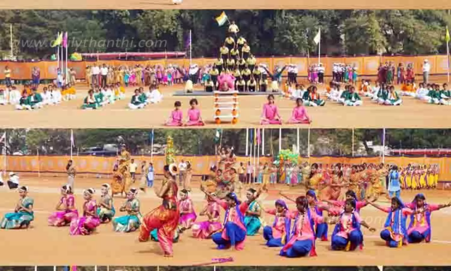 இதனை தொடர்ந்து திருச்சி மாவட்டத்தில் உள்ள 7 பள்ளி மாணவ, மாணவிகளின் கலை நிகழ்ச்சிகள் நடந்தன. நாட்டுப்பற்று, தேச ஒருமைப்பாட்டை விளக்கும் வகையில் நாட்டுப்புற பாடல்கள் பாடியும், நடனம் ஆடியும் மாணவிகள் பல்வேறு நிகழ்ச்சிகளை நடத்தினார்கள். சாகச நிகழ்ச்சிகளும் நடத்தப்பட்டன. சிலம்பாட்டம் உள்பட வீர விளையாட்டுகளும் இடம் பெற்றன. இதனை விழாவில் கலந்து கொண்ட முக்கிய பிரமுகர்கள், பொதுமக்கள் ரசித்து பார்த்தனர்.