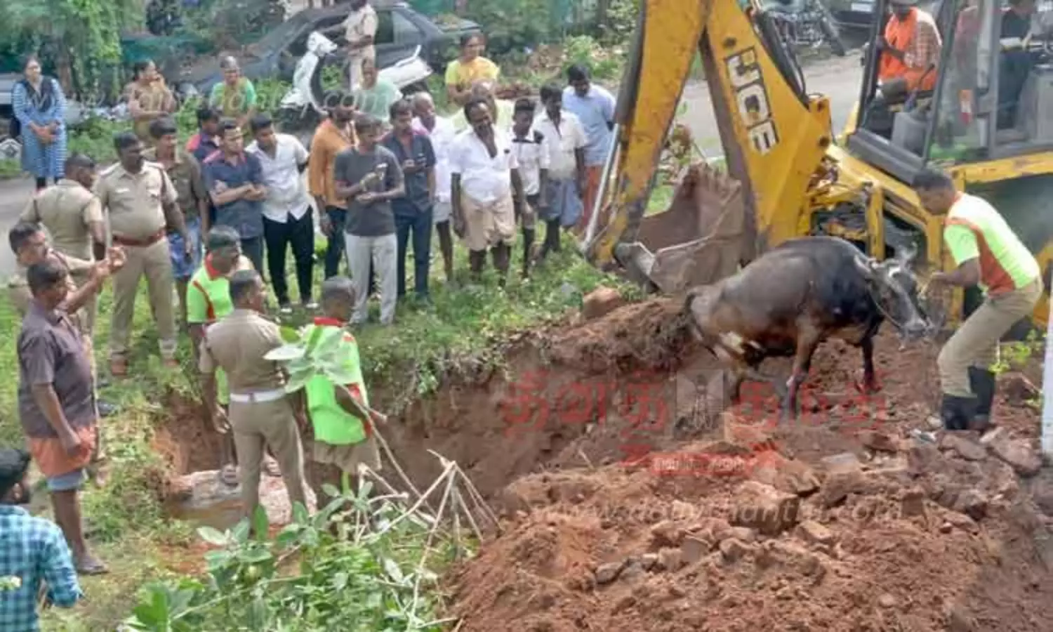 பொள்ளாச்சி -பாலக்காடு ரோட்டை சேர்ந்தவர் சண்முகசுந்தரம். இவர் நகர மேற்கு போலீஸ் நிலையத்திற்கு பின்புறம் உள்ள இடத்தில் மாடுகளை மேய்ச்சலுக்கு விடுவது வழக்கம். இந்த நிலையில் நேற்று மாட்டை வழக்கம் போல் மேய்ச்சலுக்கு விட்டு விட்டு அவர் சென்று விட்டார். மாட்டை கயிறு வைத்து கட்டாமல் விட்டதால், மேய்ந்து கொண்டே அந்த பகுதியில் உள்ள ஒரு தனியார் ஆஸ்பத்திரியின் பாழடைந்த கட்டிடம் இருந்த பகுதிக்கு வந்தது. புதருக்குள் தண்ணீர் தொட்டி தெரியாததால் மாடு திடீரென்று கால் தவறி தொட்டிக்கு விழுந்தது. மாடு விழுந்த சத்தத்தை கேட்டு பொதுமக்கள் வந்து பார்த்தனர். இதுகுறித்து பொள்ளாச்சி தீயணைப்பு நிலையத்துக்கு தகவல் தெரிவிக்கப்பட்டது. இந்த தகவலின் பேரில் நிலைய அலுவலர் கணபதி தலைமையில் தீயணைப்பு வீரர்கள் விரைந்து வந்தனர். பின்னர் பொக்லைன் எந்திரம் மூலம் தொட்டியின் அருகில் குழி தோண்டி தொட்டியை உடைத்தனர். இதையடுத்து மாடு பத்திரமாக தொட்டியை விட்டு வெளியே வந்தது.