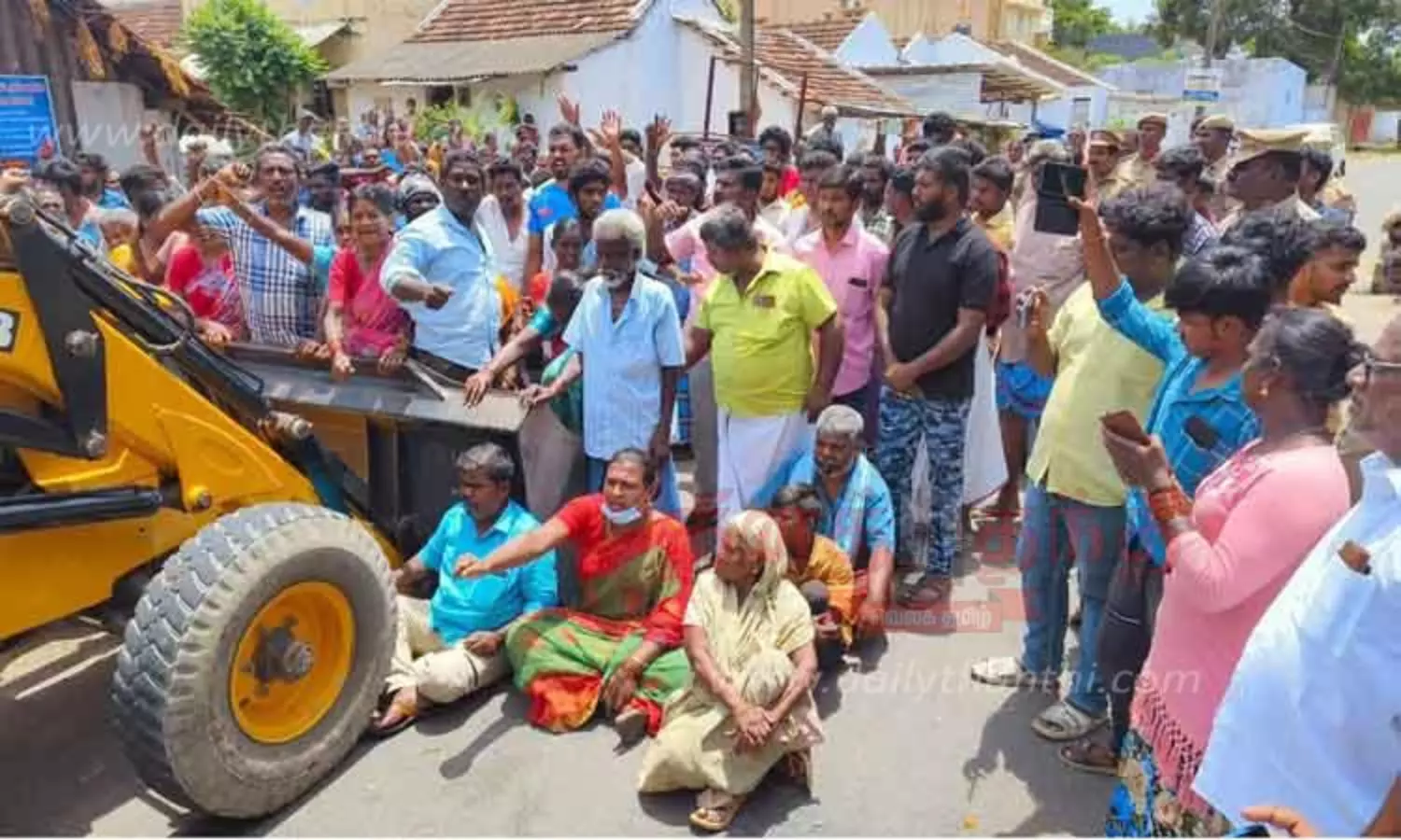 பொள்ளாச்சி நகராட்சிக்கு உட்பட்ட டி.கோட்டாம்பட்டி அண்ணா நகரில் நகராட்சி இடத்தை ஆக்கிரமித்து வீடுகள் கட்டப்பட்டு இருப்பதாக ஒருவர் சென்னை ஐகோர்ட்டில் வழக்கு தொடர்ந்தார். வழக்கை விசாரித்த நீதிபதி ஆக்கிரமிப்பு வீடுகளை இடித்து அகற்ற நகராட்சி அதிகாரிகளுக்கு உத்தரவிட்டார். அதன் பேரில் வீடுகளை இடிக்க பொக்லைன் எந்திரம் வரவழைக்கப்பட்டது. இதற்கு எதிர்ப்பு தெரிவித்து பொதுமக்கள் வீடுகளை இடிக்க விடாமல் சாலையில் அமர்ந்து போராட்டத்தில் ஈடுபட்டனர். மேலும் பொக்லைன் எந்திரத்தின் மீது ஏறி நின்று, அதனை முற்றுகையிட்டதால் பரபரப்பு ஏற்பட்டது. இதையடுத்து நகராட்சி அதிகாரிகள், வருவாய்த்துறையினர், போலீசார் பொதுமக்களிடம் பேச்சுவார்த்தை நடத்தினர். அவர்கள் 30 ஆண்டுகளாக யாருக்கும் எந்த இடையூறு இல்லாமல் வசித்து வருகிறோம். இங்கிருந்து வேறு இடத்திற்கு செல்ல மாட்டோம் என்றனர்.