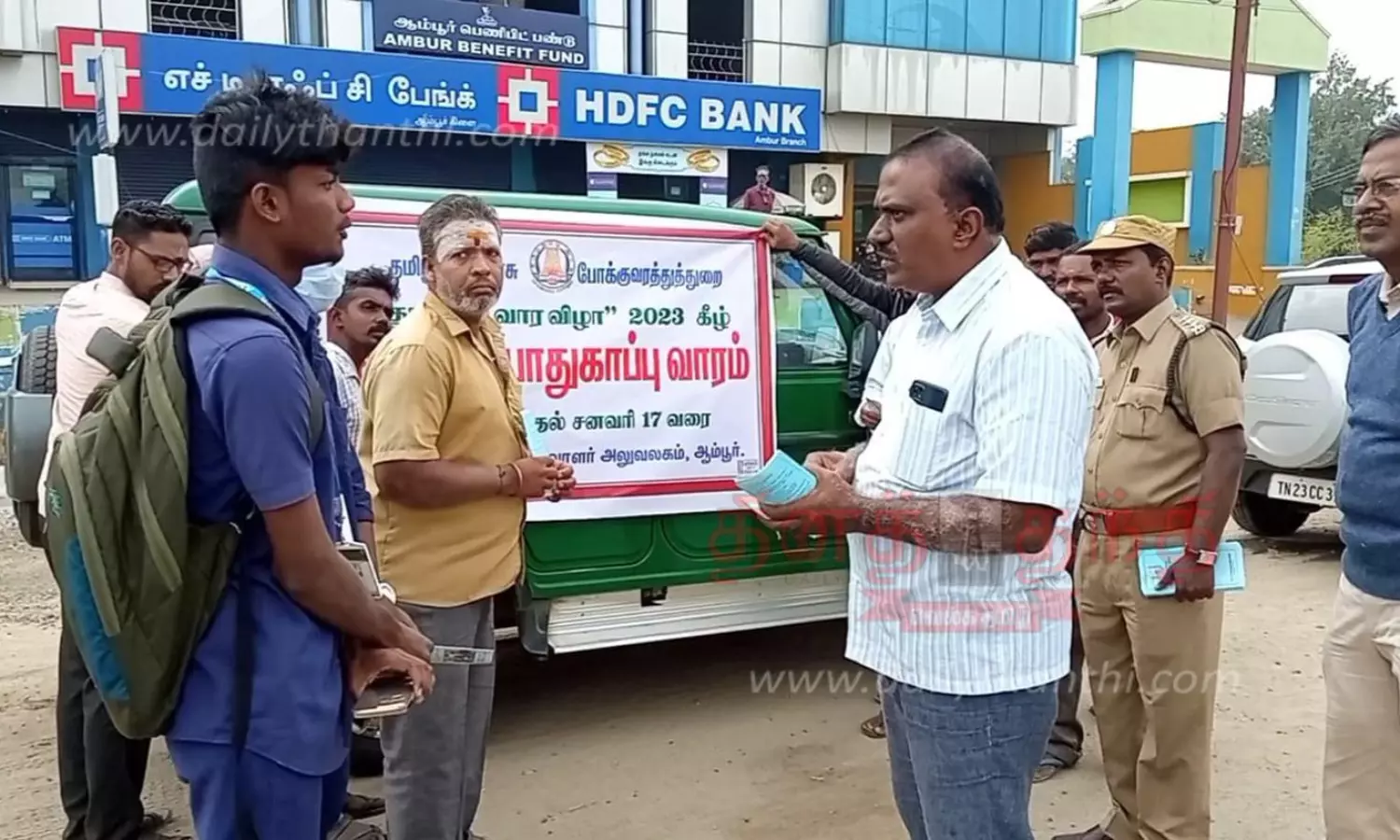 சாலை பாதுகாப்பு வார விழாவை முன்னிட்டு ஆம்பூர் பைபாஸ் சாலை அருகே போக்குவரத்துத் துறை சார்பில் விழிப்புணர்வு நிகழ்ச்சி நடைபெற்றது. வாணியம்பாடி வட்டார போக்குவரத்து அலுவலர் ராமகிருஷ்ணன் தலைமை தாங்கினார்.