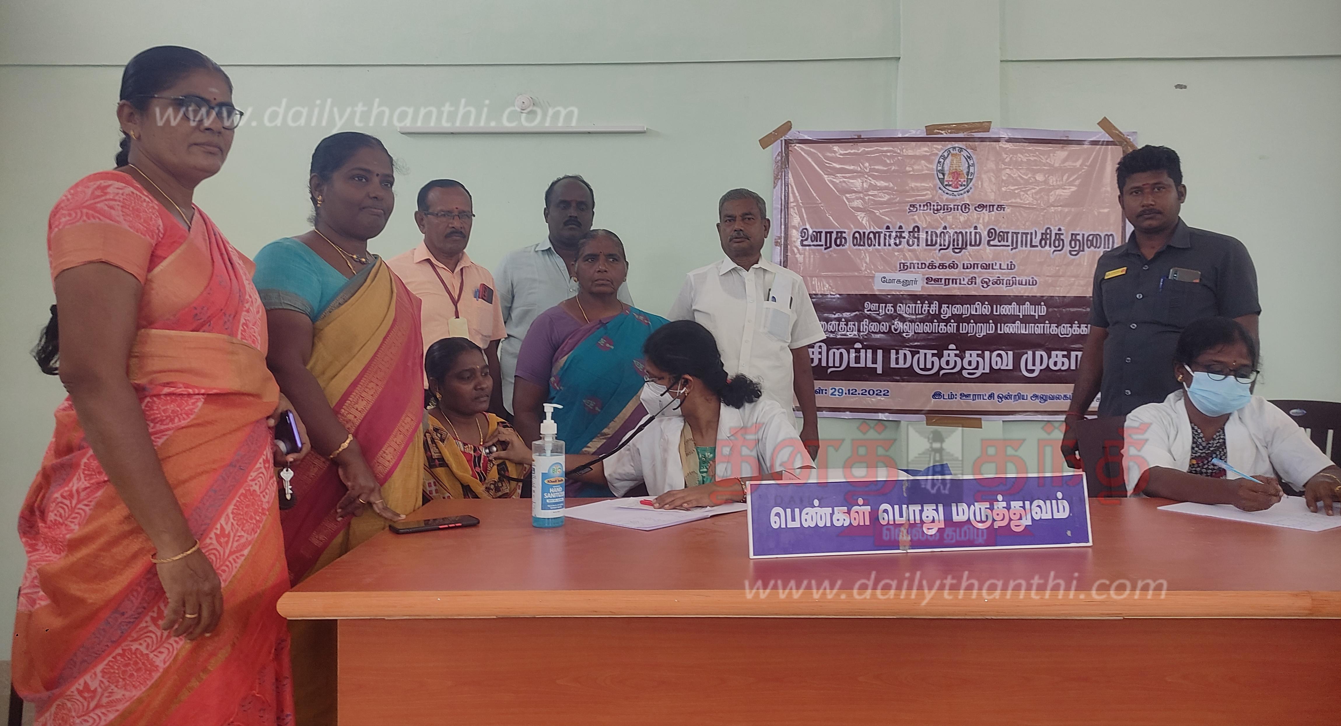 மோகனூர் ஒன்றியத்தில் தமிழக ஊரக வளர்ச்சி மற்றும் ஊராட்சி துறை சார்பில் உள்ள ஊரக வளர்ச்சித் துறையில் பணிபுரியும், அனைத்து நிலை அலுவலர்கள் மற்றும் பணியாளர்களுக்கு சிறப்பு மருத்துவ முகாம் ஊராட்சி ஒன்றிய அலுவலக கூட்ட அரங்கில் நடைபெற்றது. முகாமிற்கு மோகனூர் ஒன்றிய குழு தலைவர் சரஸ்வதி கருமண்ணன் தலைமை தாங்கி தொடங்கி வைத்தார். இதில் மோகனூர் வட்டார வளர்ச்சி அலுவலர்கள் தேன்மொழி, முனியப்பன், ஒன்றிய குழு உறுப்பினர் ரேணுகாதேவி சண்முகம் ஆகியோர் முன்னிலை வசித்தனர். முகாமில் பொது மருத்துவம், கண், பல், சித்தா, தோல், காசநோய், சர்க்கரை, ரத்த அழுத்தம், சிறுநீர், ரத்த பரிசோதனை உள்பட பல்வேறு சோதனைகள் செய்யப்பட்டது. மோகனூர் ஊராட்சி ஒன்றியத்திற்கு உட்பட்ட 25 ஊராட்சிகளில் இருந்து ஏராளமானோர் கலந்து கொண்டு சிகிச்சை பெற்றனர். இதில் மோகனூர் அரசு ஆரம்ப சுகாதார நிலைய டாக்டர் லாவண்யா, டாக்டர்கள் ரேகா, சண்முகம், பல் டாக்டர் அருண், சித்தா மருத்துவர் தமிழரசி, மோகனூர் வட்டார சுகாதார மேற்பார்வையாளர் செல்வராஜா, மற்றும் சுகாதார ஆய்வாளர்கள், மருத்துவமல்லா மேற்பார்வையாளர்கள், செவிலியர்கள் உள்பட மருத்துவத்துறை சார்ந்தவர்கள் கலந்து கொண்டு சிகிச்சை அளித்தனர்.