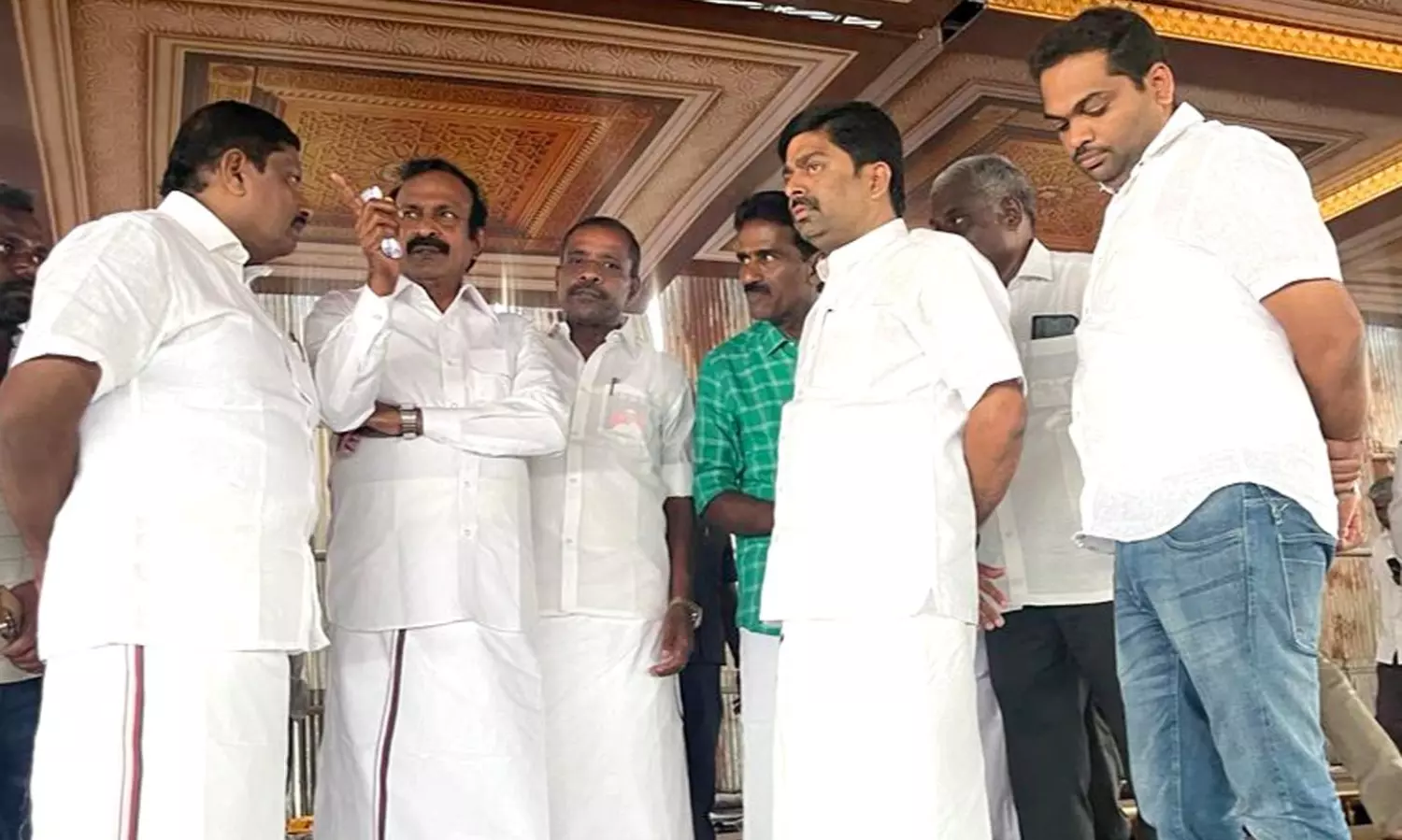 இந்த கூட்டத்தில் தி.மு.க. தலைவரும், முதல்-அமைச்சருமான மு.க.ஸ்டாலின் பங்கேற்று பேசுகிறார். இதற்காக 40 ஏக்கர் நிலத்தில் பிரமாண்ட மேடை மற்றும் பந்தல் அமைக்கும் பணிகள் நடைபெற்று வருகிறது. மேடை அமைப்பு, இருக்கை வசதி, பந்தல் அமைப்பது, கூட்டத்துக்கு வரும் தொண்டர்களுக்கு உணவு, தண்ணீர் வசதி உள்ளிட்ட ஏற்பாடுகள் குறித்து வீட்டுவசதி மற்றும் மதுவிலக்கு ஆயத்தீர்வு துறை அமைச்சர் முத்துசாமி நேற்று தொட்டிப்பாளையத்தில் உள்ள கூட்டம் நடக்கும் மைதானத்துக்கு வந்து ஆய்வு செய்தார்.