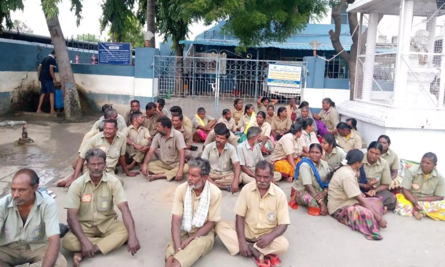 தமிழகம் முழுவதும் திடக்கழிவு மேலாண்மை பணிகள் தனியாருக்கு விடப்பட்டுள்ளது. இதற்கு பல்வேறு கட்சிகள் எதிர்ப்பு தெரிவித்து வருவதுடன் பல கட்டங்களாக போராட்டமும் நடைபெற்று வருகிறது. இந்த நிலையில் திருமுருகன்பூண்டி நகராட்சியில் கடந்த 15 நாட்களுக்கு முன்பு 3 தொழிலாளர்களை ஒப்பந்ததாரர் பணிநீக்கம் செய்துள்ளார். இந்த நடவடிக்கைக்கு சி.ஐ.டி.யு. சங்கம் கடும் எதிர்ப்பு தெரிவித்ததுடன் பணி நீக்கம் செய்யப்பட்ட தொழிலாளர்களை உடனடியாக பணியில் சேர்க்க வேண்டும் என்று வலியுறுத்தி நகராட்சி கமிஷனர் மற்றும் தலைவருக்கு கோரிக்கை மனு வழங்கப்பட்டது. ஆனால் இதற்கு ஒப்பந்ததாரர் மறுப்பு தெரிவித்ததாக கூறப்படுகிறது. பணி நீக்கம் செய்யப்பட்ட ெதாழிலாளர்களை வேலைக்கு சேர்க்க வலியுறுத்தி சி.ஐ.டி.யு. ஊரக வளர்ச்சி, உள்ளாட்சித்துறை ஊழியர் சங்கம் சார்பில் காலை 7 மணி முதல் தூய்மை பணியாளர்கள் வேலையை புறக்கணித்து நகராட்சி அலுவலகம் முன்பு தரையில் அமர்ந்து போராட்டத்தில் ஈடுபட்டனர்.