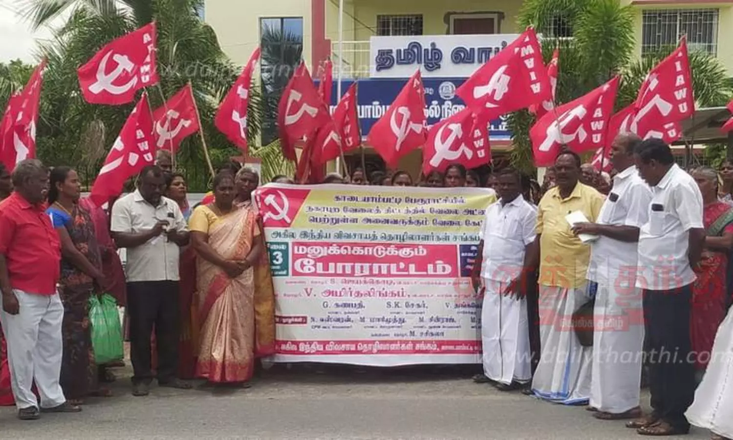 காடையாம்பட்டி பேரூராட்சி அலுவலகத்தில் விவசாய தொழிலாளர் சங்கத்தினர் மனு கொடுக்கும் போராட்டம்
