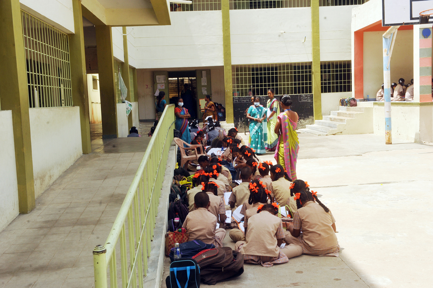 கடந்த சில தினங்களாக திருவண்ணாமலை பரவலாக மழை பெய்து வருகின்றனர். பகல் நேரத்தில் மழை பெய்ததால் வகுப்பறை இல்லாமல் வெளியில் அமர்ந்து படிக்கும் மாணவிகள் அங்குள்ள போர்ட்டிகோவில் தஞ்சம் அடைகின்றனர்.