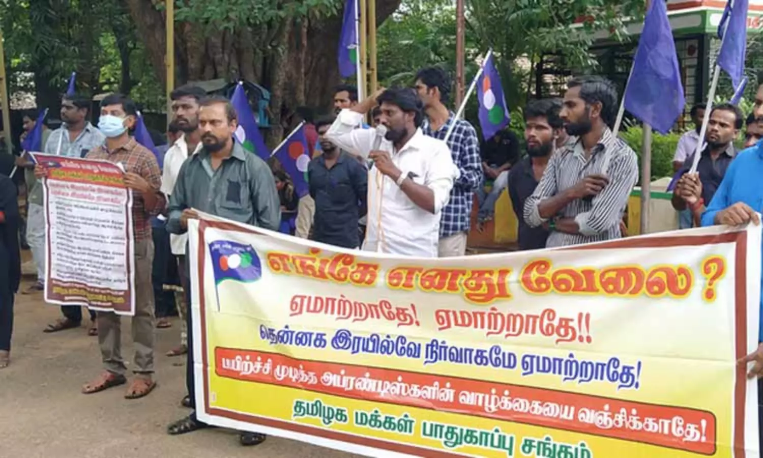 ெரயில்வேயில் பயிற்சி (அப்ரண்டீஸ்) முடித்தவர்களுக்கு பணி வழங்காததை கண்டித்து தமிழக மக்கள் பாதுகாப்பு சங்கத்தினர் பொன்மலை ெரயில்வே பணிமனை முன்பு கருப்பு தீபாவளி ஆர்ப்பாட்டம் நடத்தினர். ஆர்ப்பாட்டத்துக்கு சங்கத்தலைவர் சக்ரபாணி தலைமை தாங்கினார். பொதுச் செயலாளர் ஆனந்தகுமார் முன்னிலை வகித்தார். ஆர்ப்பாட்டத்தில், 2008- ல் பயிற்சி முடிந்தவர்களுக்கு உடனடியாக பணி நியமனம் செய்ய வேண்டும். தெற்கு ெரயில்வேயில் அப்ரண்டீஸ் முடித்தவர்களுக்கு பழைய முறையில் பணி நியமனம் செய்ய வேண்டும். வடமாநில இளைஞர்களுக்கு வழங்கப்பட்ட பணி நியமன ஆணைைய ரத்து செய்ய வேண்டும். காலி பணியிடங்களை நிரப்ப வேண்டும் என்பன உள்பட பல்வேறு கோரிக்கைகள் வலியுறுத்தப்பட்டன.