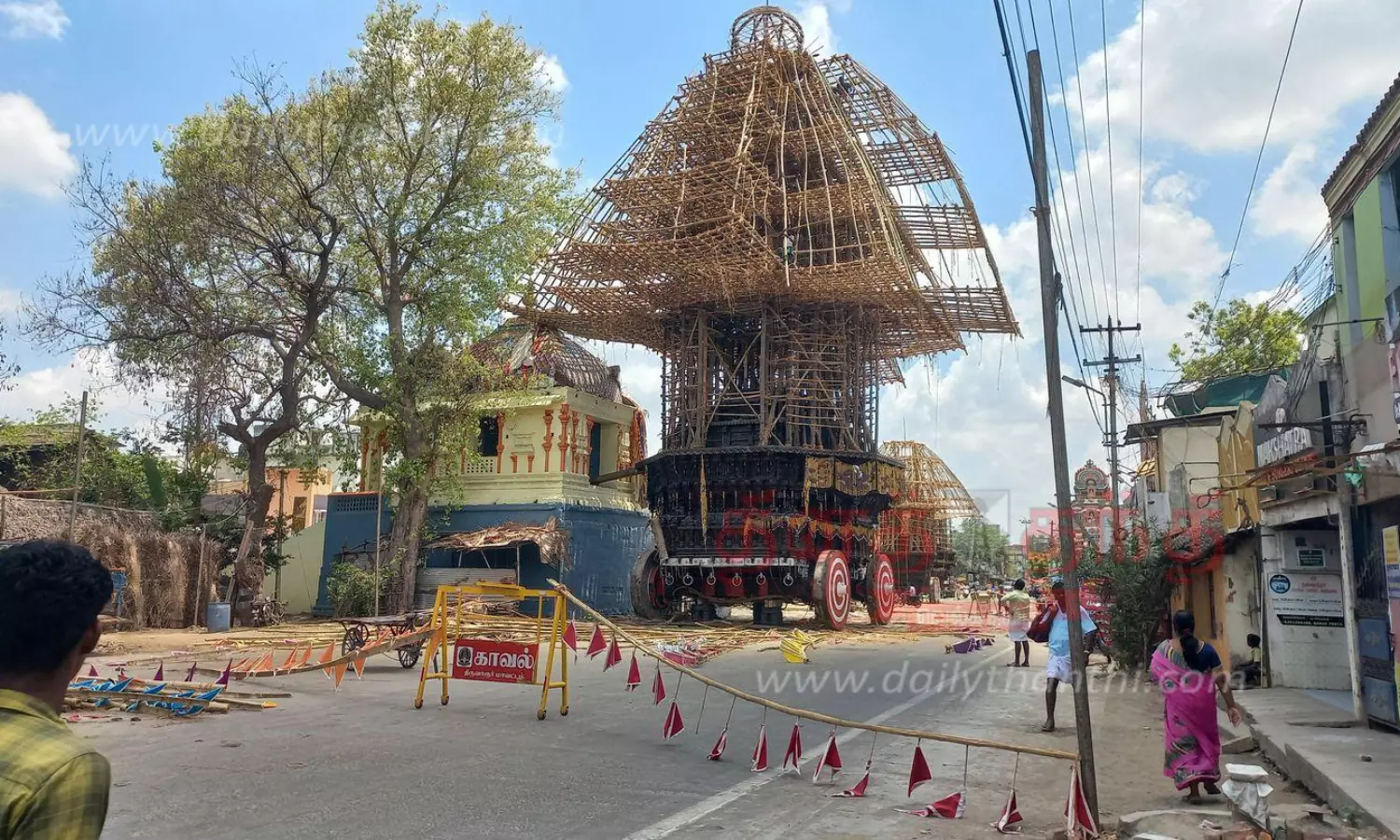 தேரோட்டம் முடிந்து 1 வாரம் கடந்த நிலையில் ஆழித்தேர் கட்டுமானங்களை பிரிக்கும் பணி தொங்கியுள்ளது. இதனால் போக்குவரத்து மாற்றம் செய்யப்பட்டிருந்தது.