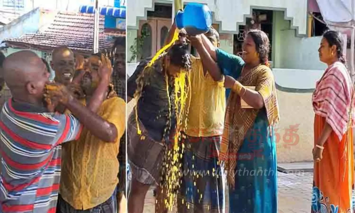 இதேபோல் சில இளைஞர்கள் தங்களது வீடுகளில் மறைந்திருந்த போதிலும் அதை ரகசியமாக கண்டுபிடித்த அவர்களின் முறைப்பெண்கள் அங்கு சென்று அவர்களின் தலையில் மஞ்சள் தண்ணீரை ஊற்றி மகிழ்ந்தனர். மாமன், மச்சான் முறை கொண்ட ஆண்களும் ஒருவருக்கொருவர் முகத்தில் மஞ்சளை பூசிக்கொண்டு மகிழ்ச்சியை வெளிப்படுத்தினர். இதன் மூலம் மாமன், மச்சான் மற்றும் முறை பெண்கள் ஆகியோரது சொந்த பந்த வாழ்க்கை நீடிக்கும் என்று கூறப்படுகிறது. நேற்று நடைபெற்ற இந்த விழாவையொட்டி அந்த பகுதி முழுவதும் மஞ்சள் தண்ணீர் பெருக்கெடுத்து ஓடியது. இந்த நிகழ்ச்சியையொட்டி அப்பகுதியே கலகலப்பாக இருந்தது.
