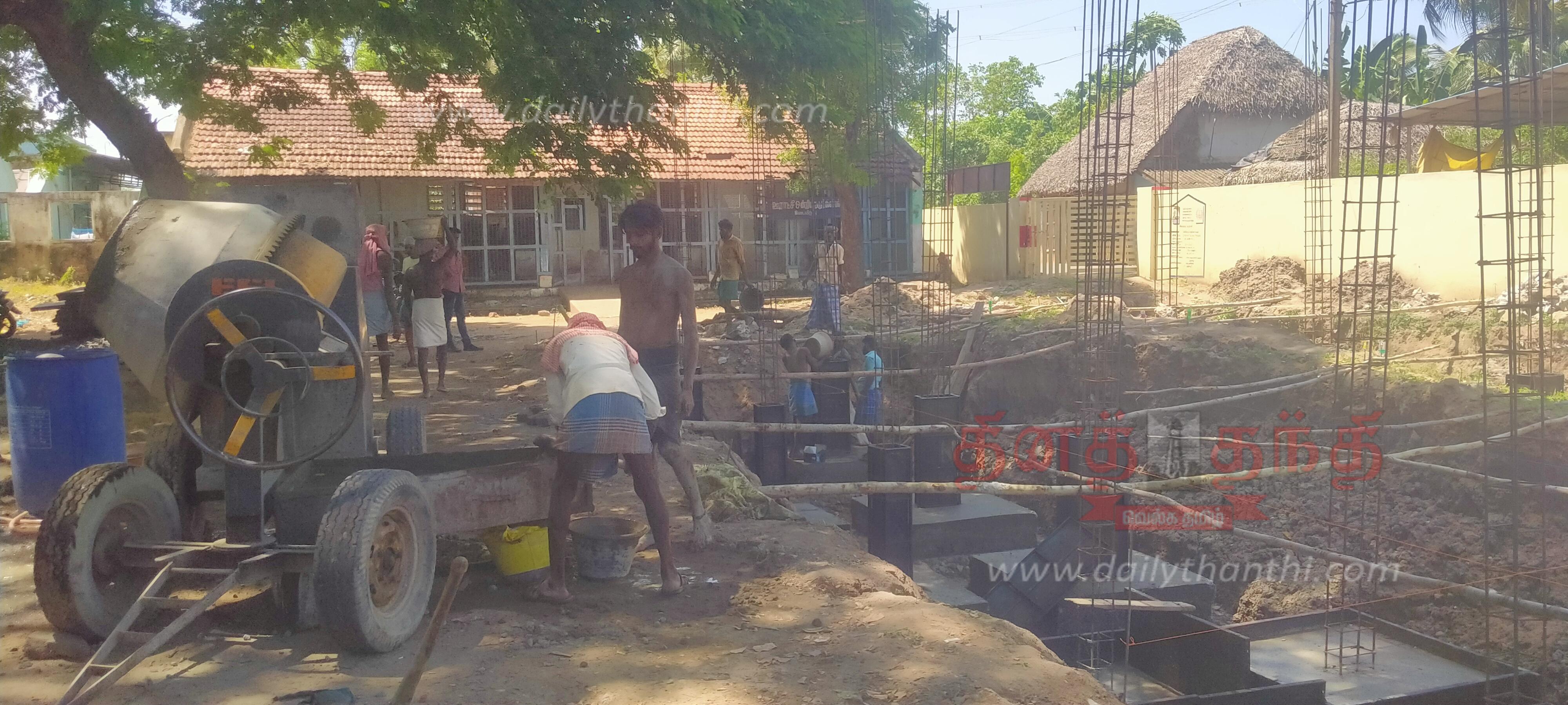 'தினத்தந்தி' செய்தி எதிரொலியாக அரசு பள்ளி வளாகத்தில் ேதாண்டப்பட்ட பள்ளத்தில் கட்டிடம் கட்டும் பணி தொடங்கியது.