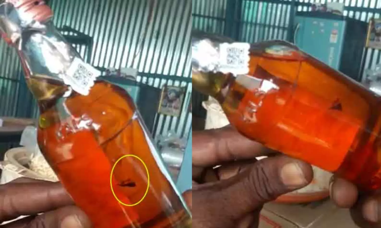 அவர் வாங்கிய மதுபான பாட்டிலை உடைப்பதற்காக குலுக்கிய போது ஏதோ பாட்டிலின் உட்புறம் மிதப்பதைக் கண்டு அதிர்ச்சிடைந்துள்ளார். அதன்பின்பு மதுபான பாட்டிலின் உள்ளே உன்னிப்பாக கவனித்து, பார்த்த போது பாட்டிலின் உட்புறம் இறந்த நிலையில் குட்டித் தவளை ஒன்று மிதந்து கொண்டிருந்துள்ளது.