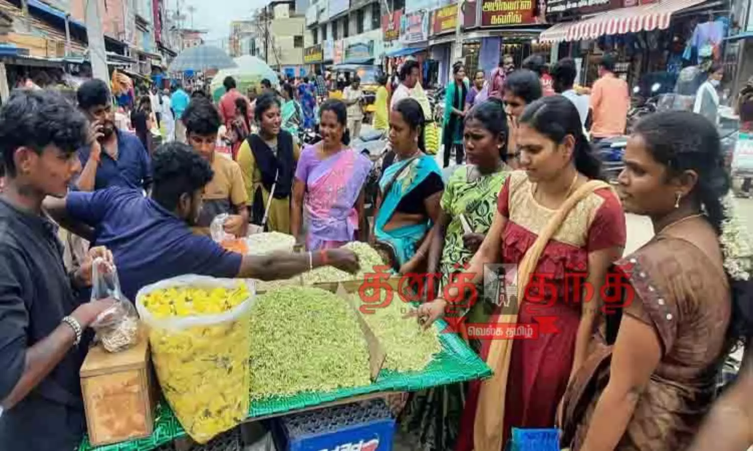 தீபாவளி பண்டிகைதீபாவளி பண்டிகையை முன்னிட்டு ராமநாதபுரம் மாவட்டத்தில் அனைத்து வகை பூக்களின் விலையும் பல மடங்கு உயர்ந்துள்ளது.(திங்கட்கிழமை) தீபாவளி பண்டிகை கோலாகலமாக கொண்டாடப்பட உள்ளது. இந்த நிலையில் தீபாவளி பண்டிகையை முன்னிட்டு அனைத்து வகை பூக்களின் விலைகளும் பல மடங்கு உயர்ந்து விட்டது. ராமநாதபுரம் பகுதியில் இதுவரை ஒரு கிலோ 1000 ரூபாயாக இருந்த மல்லிகைப்பூ ரூ.1500 ஆகவும், 800 ரூபாயாக இருந்த பிச்சிப்பூ ரூ.1200 ஆகவும், 2000 ரூபாயாக இருந்த கனகாம்பரம் ரூ.2500 ஆகவும், 1000 ரூபாயாக இருந்த முல்லைப்பூ ரூ.1500 ஆகவும், 300 ரூபாயாக இருந்த ரோஜாப்பூ ரூ.400 என அனைத்து வகை பூக்களும் பல மடங்கு விலை உயர்ந்து விட்டது.
