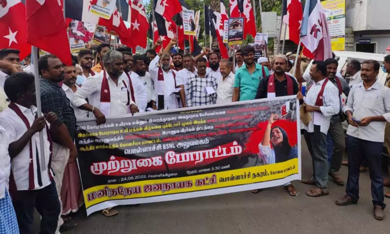 அக்னிபத் திட்டத்தை ரத்து செய்ய வேண்டும் என்பது உள்பட பல்வேறு கோரிக்கைகளை வலியுறுத்தி பொள்ளாச்சி பி.எஸ்.என்.எல். அலுவலகம் முன்பு நேற்று மாலை மனிதநேய ஜனநாயக கட்சியினர் முற்றுகை போராட்டத்தில் ஈடுபட்டனர்.