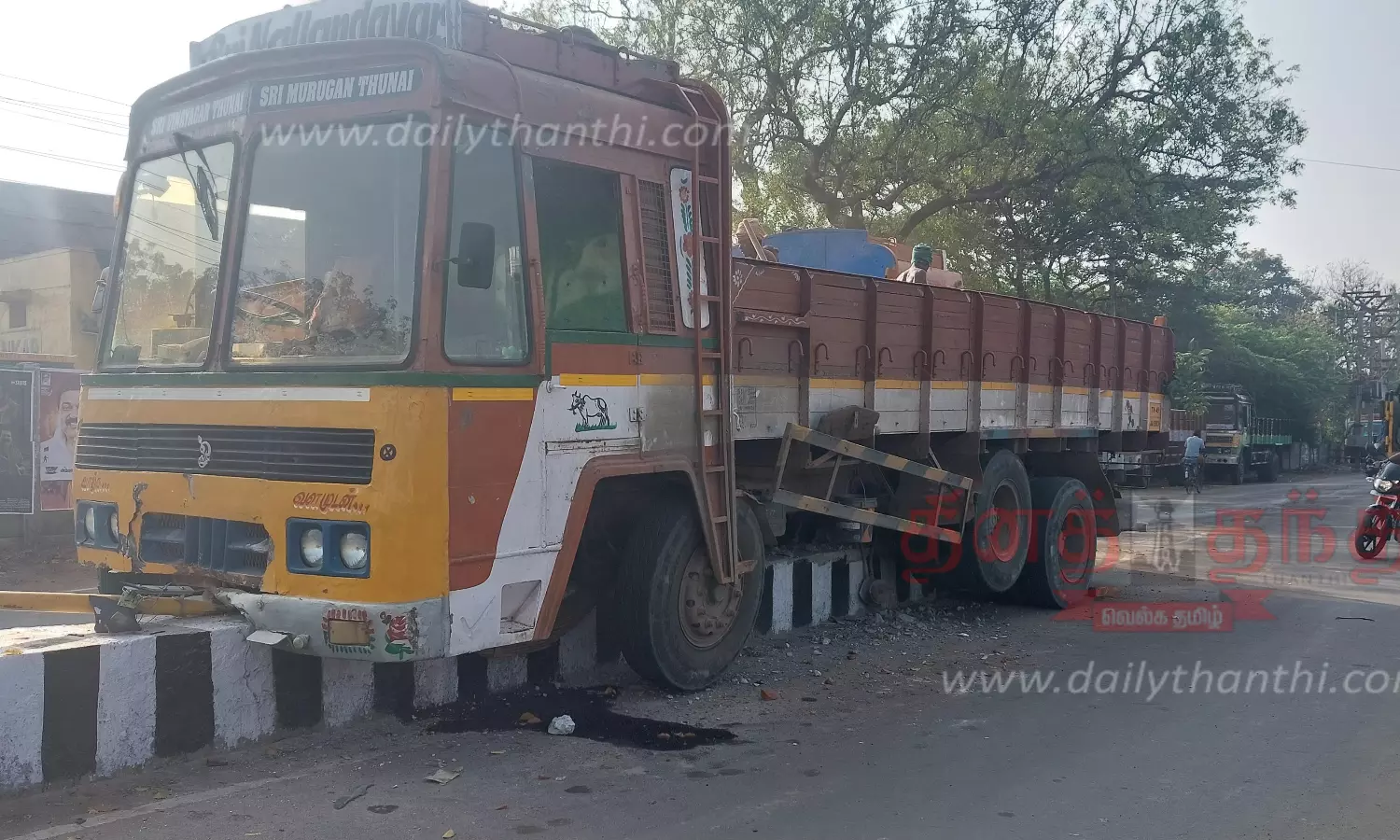 மன்னார்குடியில் சாலை தடுப்புச்சுவரில் லாரி மோதியது;
