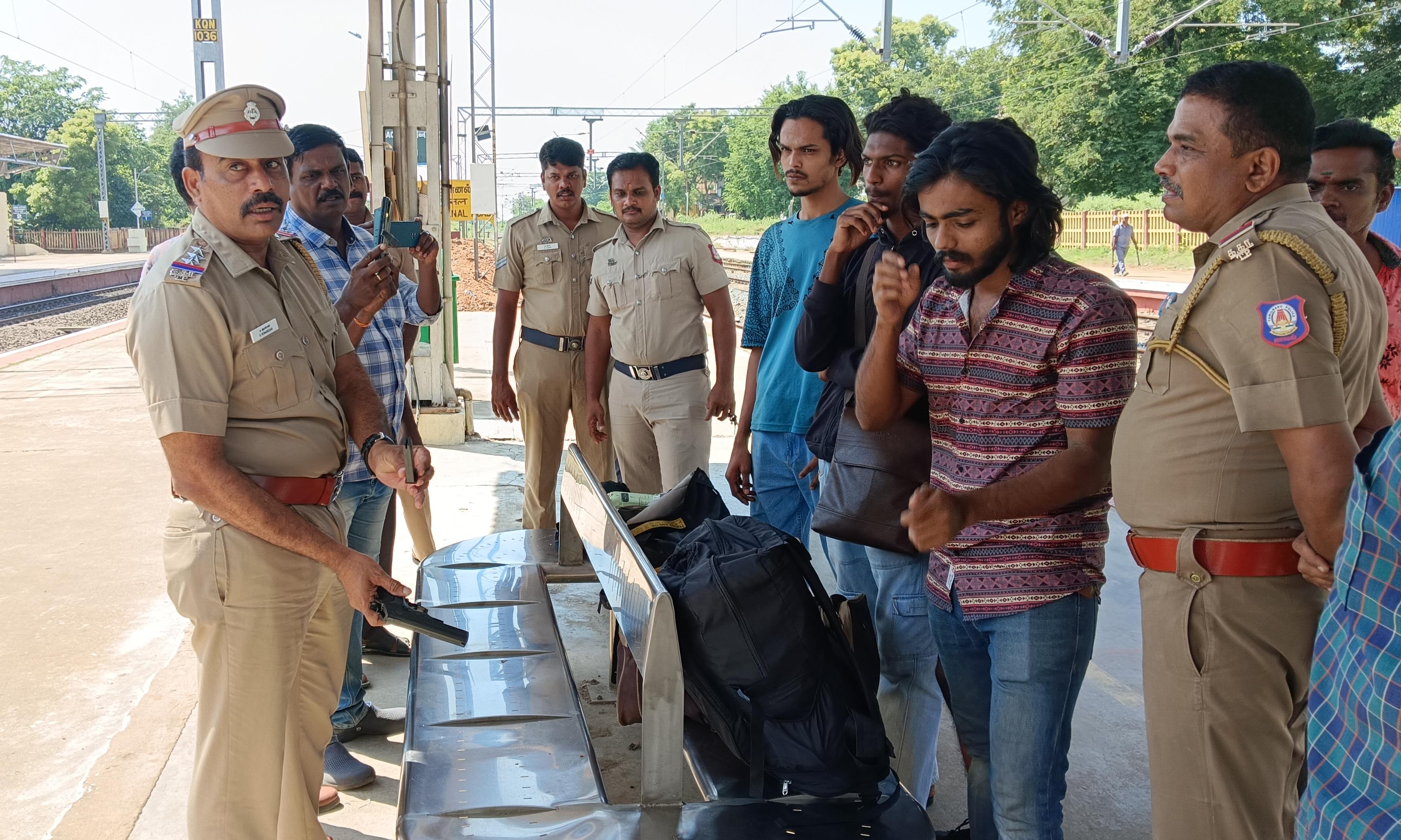 இதைப்பார்த்து நடைமேடையில் காத்திருந்த பயணிகள் 4 பேரையும் பிடிக்க முயன்றனர். இதற்கிடையே அங்கு விரைந்து வந்த கொடைரோடு ரெயில்வே போலீசார் 4 பேரையும் மடக்கிப்பிடித்தனர். பின்னர் அவர்களை ரெயில் நிலைய நடைமேடையில் உள்ள போலீஸ் நிலையத்துக்கு விசாரணைக்காக அழைத்து சென்றனர். இதுகுறித்து தகவலறிந்த நிலக்கோட்டை போலீஸ் துணை சூப்பிரண்டு முருகன், அம்மையநாயக்கனூர் போலீஸ் இன்ஸ்பெக்டர் குமரேசன், சப் இன்ஸ்பெக்டர் சேக் அப்துல்லா ஆகியோர் ரெயில் நிலையத்துக்கு வந்தனர்.