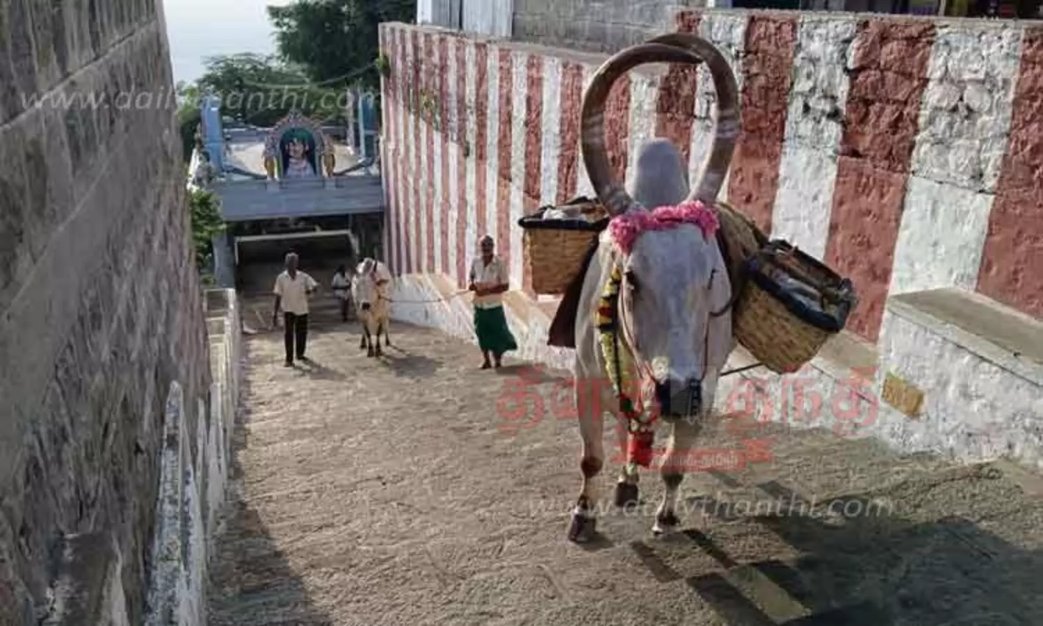 வயது முதிர்வு காரணமாக கடந்த சில மாதங்களாக திருமஞ்சனம் கொண்டு சென்ற காளை மாடு படிக்கட்டுகளில் ஏறி செல்ல சிரமப்பட்டு வருகிறது.