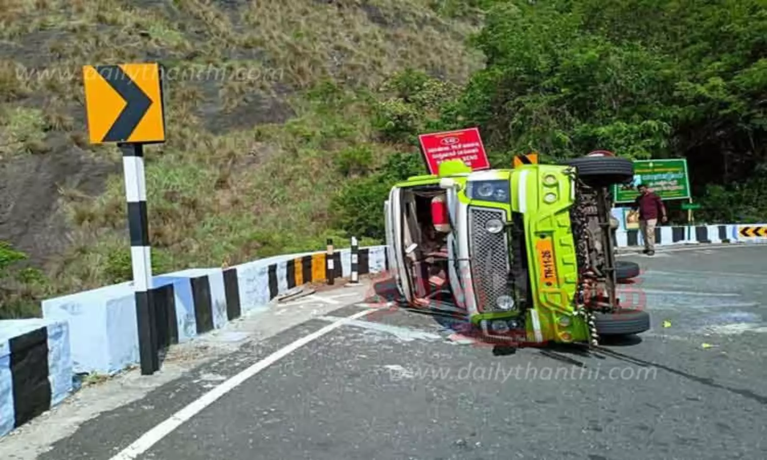 வேன் கவிழ்ந்ததில் உள்ளே இருந்த 17 பேரில் 11 சுற்றுலா பயணிகள் காயம் அடைந்தனர்.