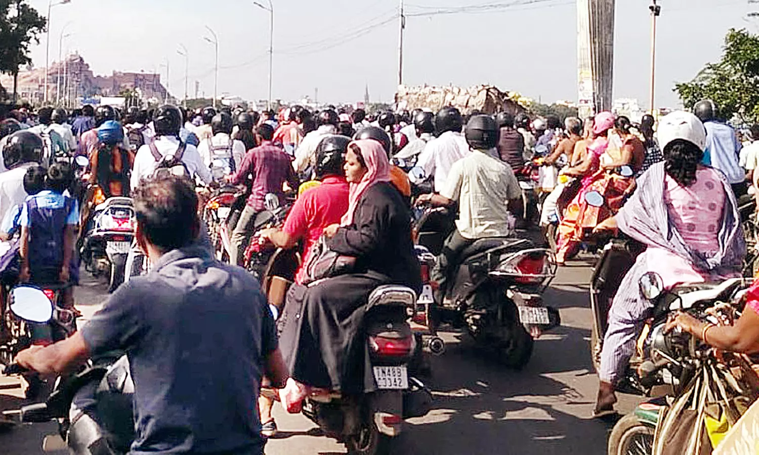 காவிரி பாலத்தில் இருசக்கர வாகன ஓட்டிகள் ஒரே நேரத்தில் திரண்டதால் போக்குவரத்து நெரிசல்