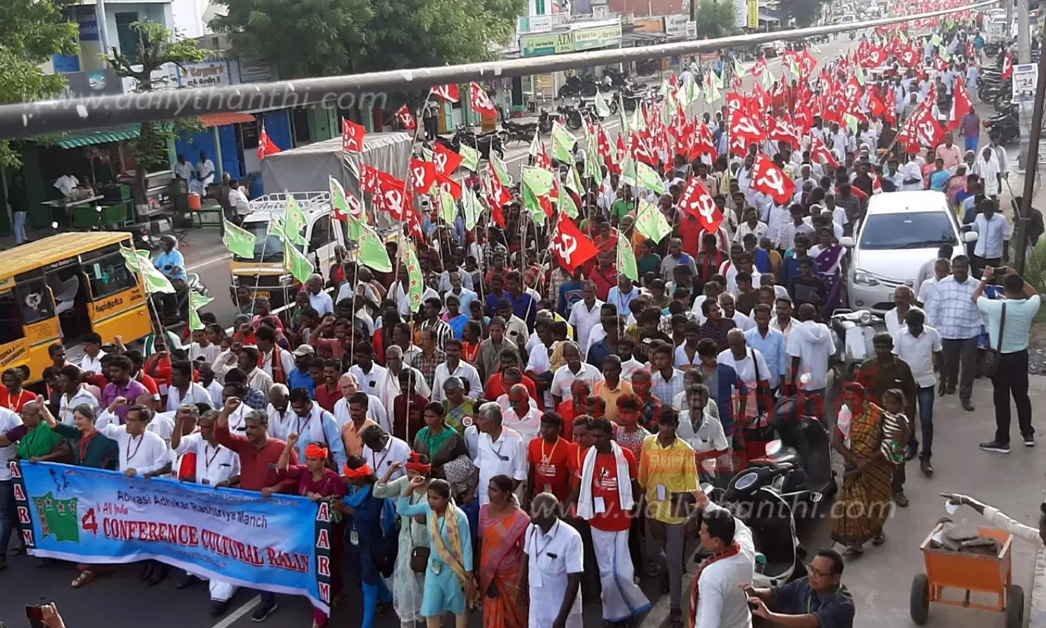 ஆதிவாசி உரிமைகளுக்கான தேசிய அமைப்பின் 4-வது அகில இந்திய மாநாடு நாமக்கல்லில் கடந்த 3 நாட்களாக நடைபெற்றது. கடைசி நாளான நேற்று பழங்குடியின மக்களின் பண்பாட்டு ஊர்வலம் நடந்தது. இந்த ஊர்வலத்தை ரெங்கசாமி கொடி அசைத்து தொடங்கி வைத்தார்.