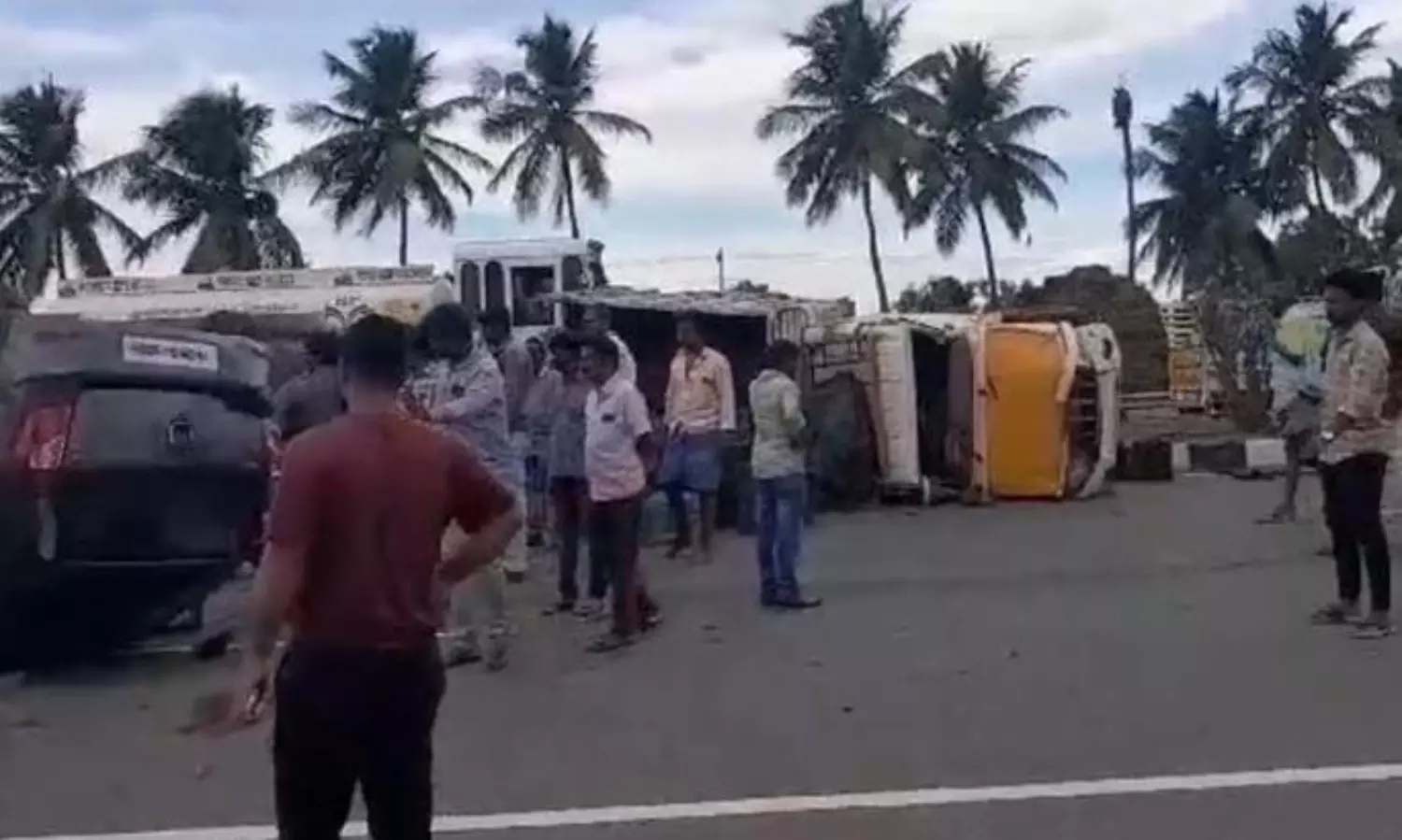கிருஷ்ணகிரியை சேர்ந்த மாதேஸ் (வயது31) மற்றும் அரவிந்த் (24) ஆகியோர் கோவையிலிருந்து கிருஷ்ணகிரி நோக்கி வேனில் வந்து கொண்டிருந்தனர். வேனை மாதேஸ் ஓட்டி வந்தார். பைபாஸ் ரோட்டில் அவினாசி வேலாயுதம்பாளையம் பிரிவு அருகே வந்தபோது எதிர்பாராதவிதமாக டிரைவரின் கட்டுப்பாட்டை இழந்த வேன் ரோட்டில் கவிழ்ந்தது. இதில் இருவருக்கும் லேசான காயம் ஏற்பட்டது. அதேசமயம் கோவையிலிருந்து கோபிசெட்டிபாளையம் நோக்கி வேனுக்கு பின்னால் ஒரு கார் வந்தது. காரை நாகராஜ் (38) என்பவர் ஓட்டி வந்தார். அவருடன் பாலாஜி என்பவரும் உடன் வந்தார்.வேன் கவிழ்ந்ததை பார்த்து கார் டிரைவர் திடீர் என பிரேக் போட்டதில் காரும் ரோட்டில் தலைகுப்புற கவிழ்ந்தது. காரில் இருந்த இருவருக்கும் லோசான காயம் ஏற்பட்டது. அப்பகுதியில் இருந்தவர்கள் காயம் அடைந்த 4 பேரையும் ஆம்புலன்ஸ் மூலம் சிகிச்சைக்காக தனியார் மருத்துவமனைக்கு அனுப்பி வைத்தனர். தகவல் அறிந்த அவினாசி போலீசார் சம்பவ இடத்திற்கு விரைந்து வந்து ரோட்டில் கவிழ்ந்து கிடந்த கார், மற்றும் வேனை அப்புறப்படுத்தினர். இந்த சம்பவத்தால் சிறிது நேரம் போக்குவரத்து பாதிக்கப்பட்டது.விபத்து குறித்து போலீசார் விசாரித்து வருகின்றனர்.