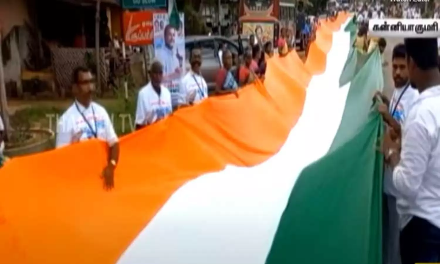 ராகுல்காந்தி கன்னியாகுமரி மாவட்டம் புலியூர் குறிச்சியில் இருந்து அழகிய மண்டபம் நோக்கி நடை பயணம் மேற்கொண்டார். அப்போது, காங்கிரஸ் தொண்டர்கள் 12 மீட்டர் அகலமும், ஆயிரம் மீட்டர் நீளமும் கொண்ட மூவர்ண கொடியை ஏந்தி அவருக்கு வரவேற்பு அளித்தனர்.
