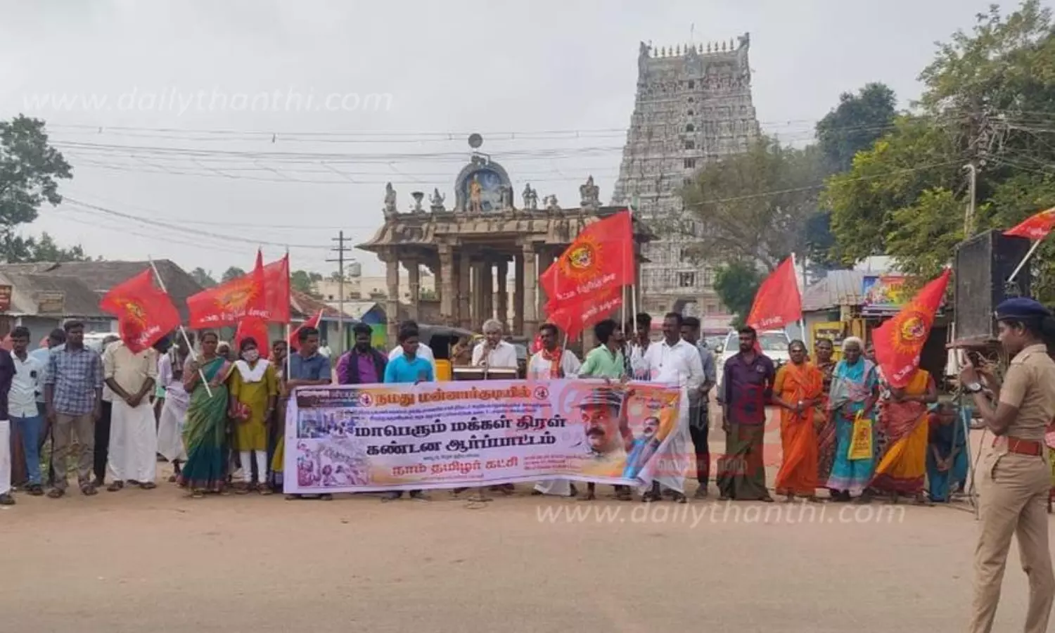 திருவாரூர் மாவட்டம் மன்னார்குடி ருக்மணி பாளையம் சாலையில் ஒரு திரையரங்கின் அருகே சாலையின் இருபுறமும் எதிர் எதிர் திசைகளில் 2 டாஸ்மாக் கடைகள் செயல்பட்டு வருகிறது. ஒரே இடத்தில் 2 டாஸ்மாக் கடைகள் செயல்படுவதால் போக்குவரத்து நெரிசல் உள்ளிட்ட பல்வேறு பிரச்சினைகளால் பொதுமக்கள் பாதிக்கப்பட்டுள்ளனர். இந்தநிலையில் நேற்று டாஸ்மாக் கடைகளை அகற்றக்கோரி நாம் தமிழர் கட்சியின் கையூட்டு ஊழல் ஒழிப்பு பாசறை சார்பில் மன்னார்குடி தேரடியில் ஆர்ப்பாட்டம் நடைபெற்றது. ஆர்பாட்டத்திற்கு நாம் தமிழர் கட்சியின் கையூட்டு ஊழல் ஒழிப்பு பாசறை அமைப்பின் மாநில தலைவர் ராம அரவிந்தன் தலைமை தாங்கினார். ஆர்ப்பாட்டத்தில் சட்டமன்ற தொகுதி கையூட்டு ஊழல் ஒழிப்பு பாசறை செயலாளர் கபிலன், இணைச்செயலாளர் முகமது இஸ்மாயில், நகர செயலாளர் பழனி, நகர இணை செயலாளர் குமரேசன், மகளிர் பாசறை நகர பொறுப்பாளர் சகாயம் உள்ளிட்ட பலர் கலந்து கொண்டனர். ஆர்ப்பாட்டத்தில் கலந்துகொண்டவர்கள் டாஸ்மாக் கடைகளை அகற்ற வேண்டும் என வலியுறுத்தி கோஷங்களை எழுப்பினர்.