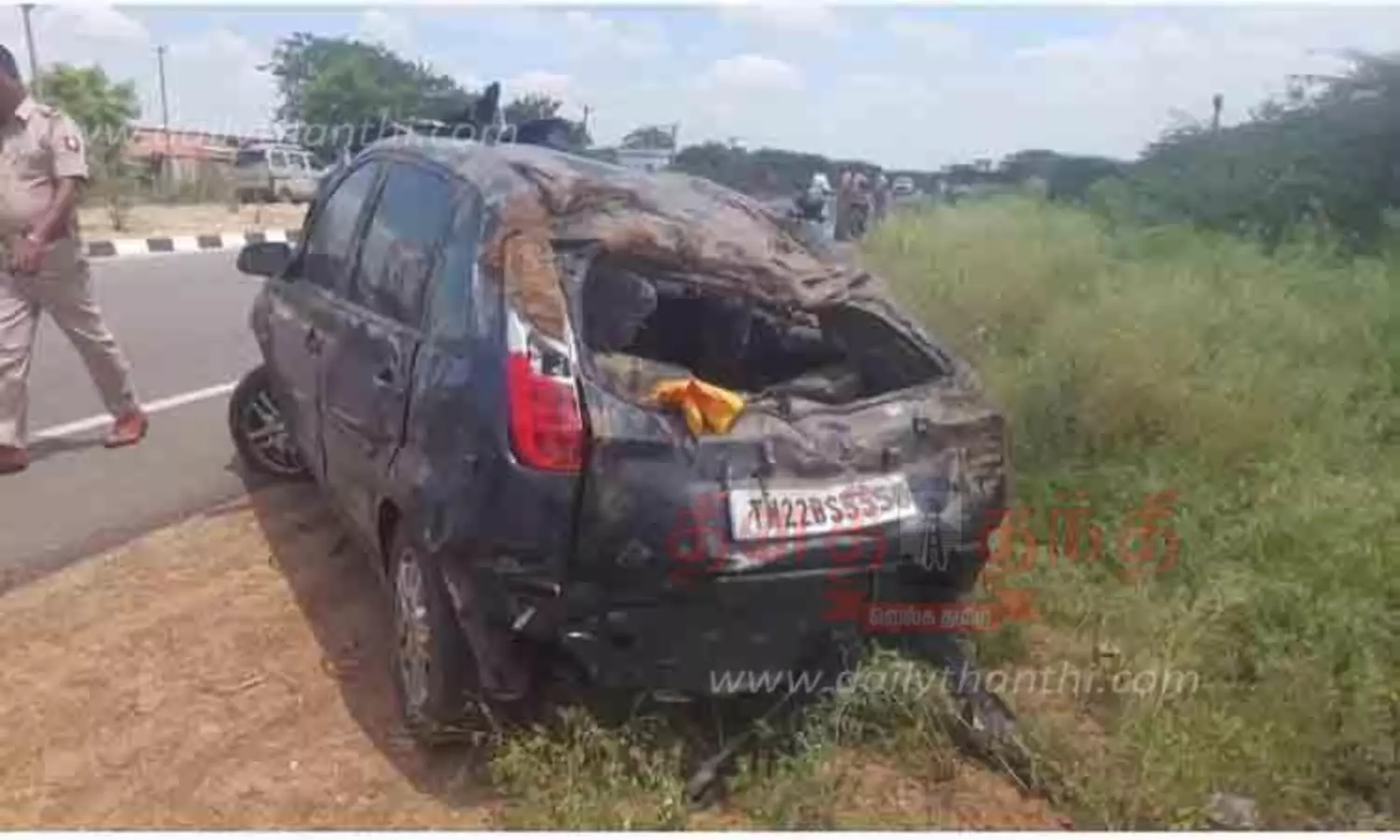 சிவகங்கை மாவட்டம் மானாமதுரை அருகே மாசாணி அம்மன் கோவில் அருகே வந்தபோது திடீரென கார் கட்டுப்பாட்டை இழந்து சாலை ஓரம் இருந்த தடுப்பின் மீது மோதி கவிழ்ந்து விபத்துக்குள்ளானது.