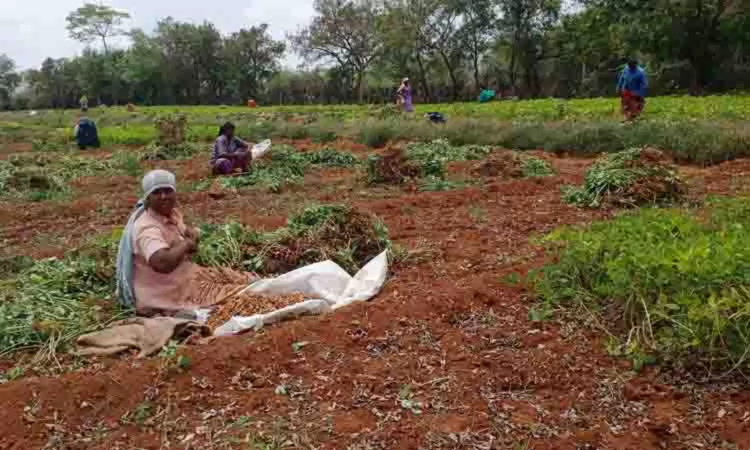 கரூர் மாவட்டம், க.பரமத்தி அருகே உள்ள குப்பக்கவுண்டன் வலசு கிராமத்தில் ஒரு வயலில் நிலக்கடலையை பறிக்கும் பெண்களை படத்தில் காணலாம்.