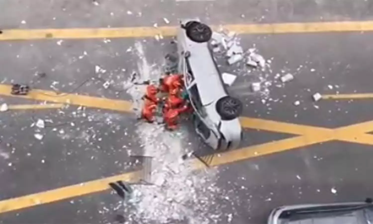சீனா: சோதனையின் போது மூன்றாவது மாடியில் இருந்து கீழே விழுந்த மின்சார காா் - 2 போ் பலி