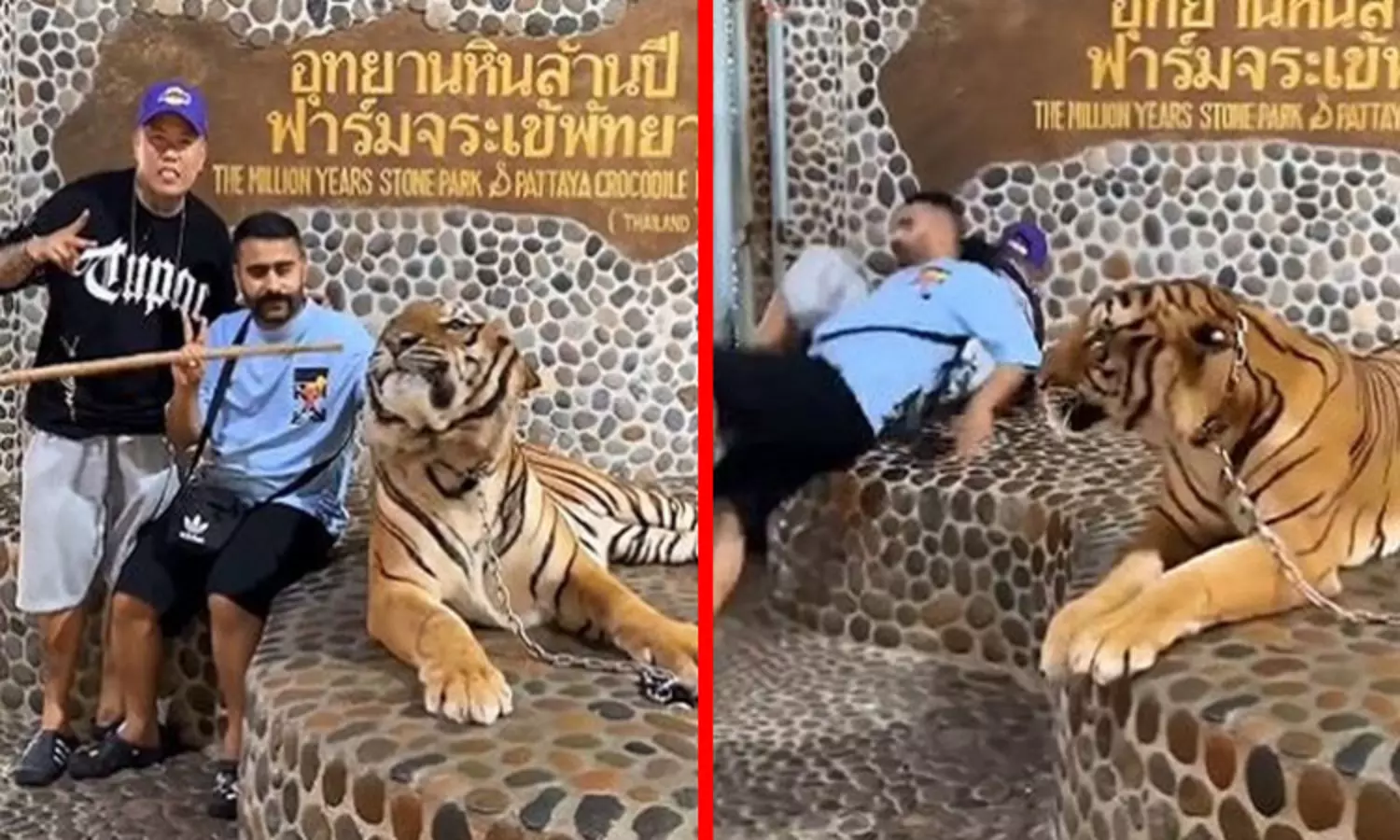 ஆனால், முன்னால் இருந்த நபர் சங்கிலியால் பிணைக்கப்பட்ட புலியை குச்சி ஒன்றை வைத்து சீண்டியபடி இருந்து உள்ளார். சற்று பொறுமை காத்த அந்த புலி திடீரென அந்த நபரை நோக்கி உறுமியது.