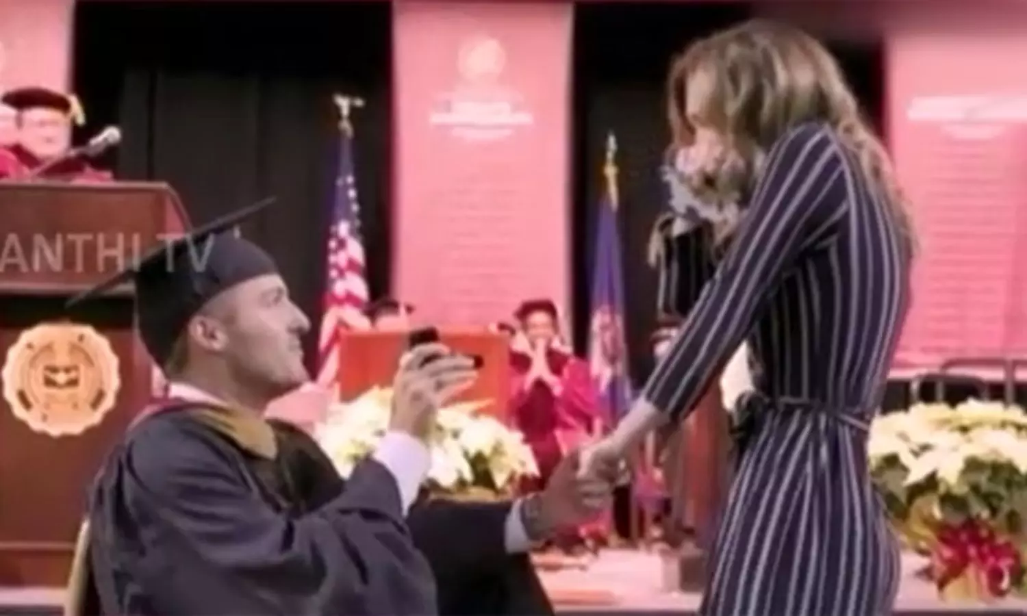 அமெரிக்காவில் கல்லூரி பட்டமளிப்பு விழாவில் முதுகலை பட்டதாரி ஒருவர் காதலிக்கு மோதிரம் அணிவித்து தனது காதலைத் தெரிவித்த விதம் அனைவரையும் கவர்ந்தது.