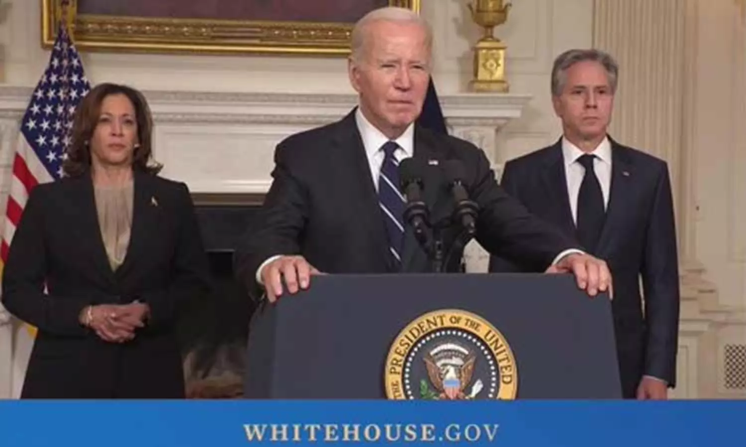 இஸ்ரேலுக்கு இங்கிலாந்து, அமெரிக்கா உள்ளிட்ட நாடுகள் ஆதரவு தெரிவித்து உள்ளன. இந்நிலையில், அமெரிக்க அதிபர் ஜோ பைடன் வெள்ளை மாளிகையில் இருந்தபடி மக்களுக்கு உரையாற்றினார். அவரது இந்த உரையின்போது, துணை அதிபர் கமலா ஹாரிஸ் மற்றும் வெளியுறவு மந்திரி அந்தோணி பிளிங்கன் உடனிருந்தனர்.