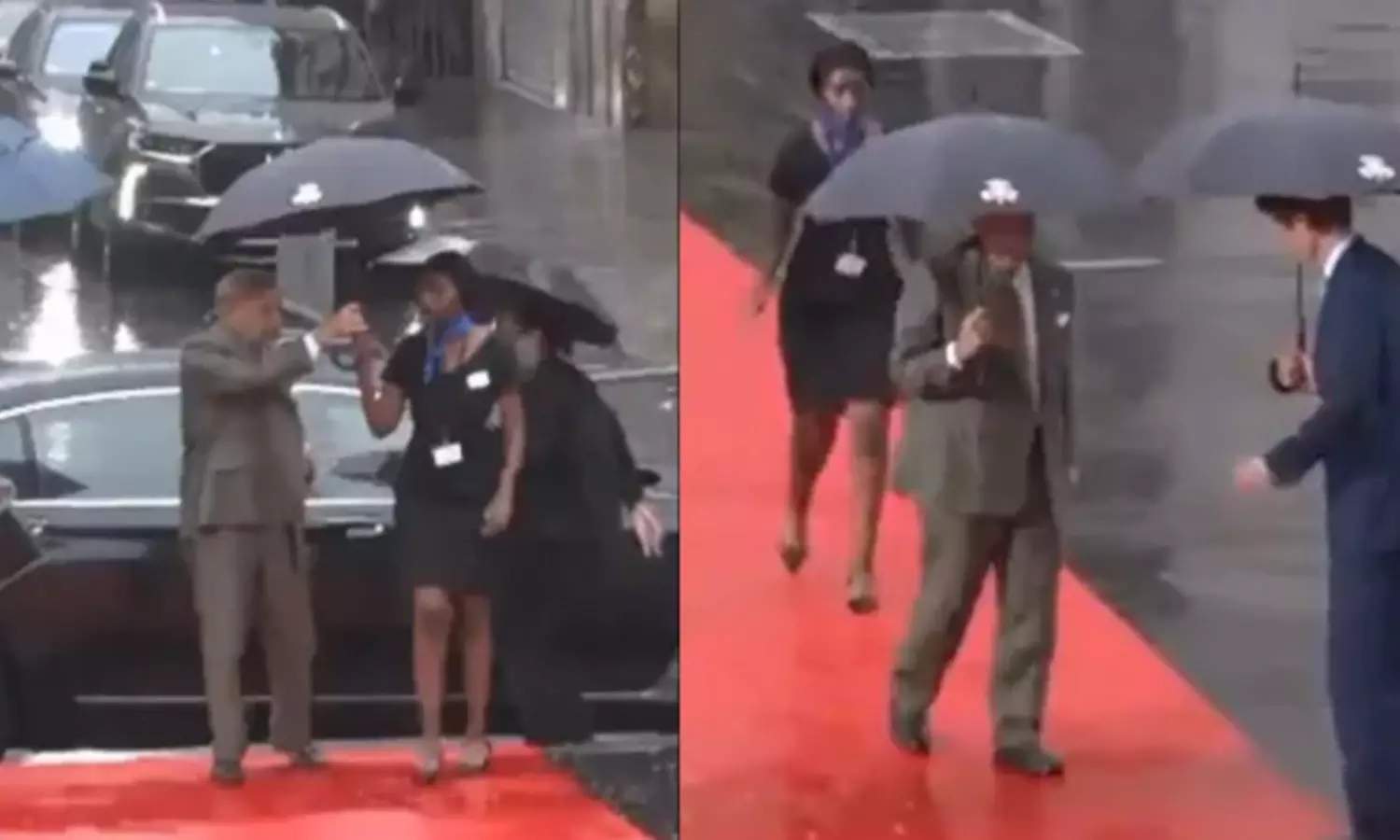 இந்நிலையில், மாநாட்டில் கலந்துகொள்ள நிகழ்ச்சி நடைபெற்றும் பகுதிக்கு பாகிஸ்தான் பிரதமர் ஷபாஷ் ஷெரிப் காரில் வந்தார். அவர் காரை விட்டு கீழே இறங்கியபோது அப்பகுதியில் மழை பெய்துகொண்டிருந்தனர். அப்போது அவரை வரவேற்க பெண் அதிகாரிகள் நின்றுகொண்டிருந்தனர்.