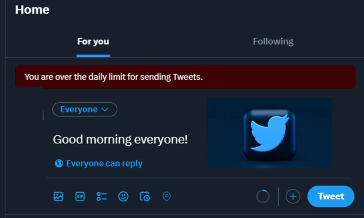 தினசரி டுவிட் வரம்பை தாண்டிவிட்டீர்கள் என்று குறிப்பிடுவதால் பயனாளர்கள் டுவிட் செய்யமுடியாமல் தவித்து வருகின்றனர்.;