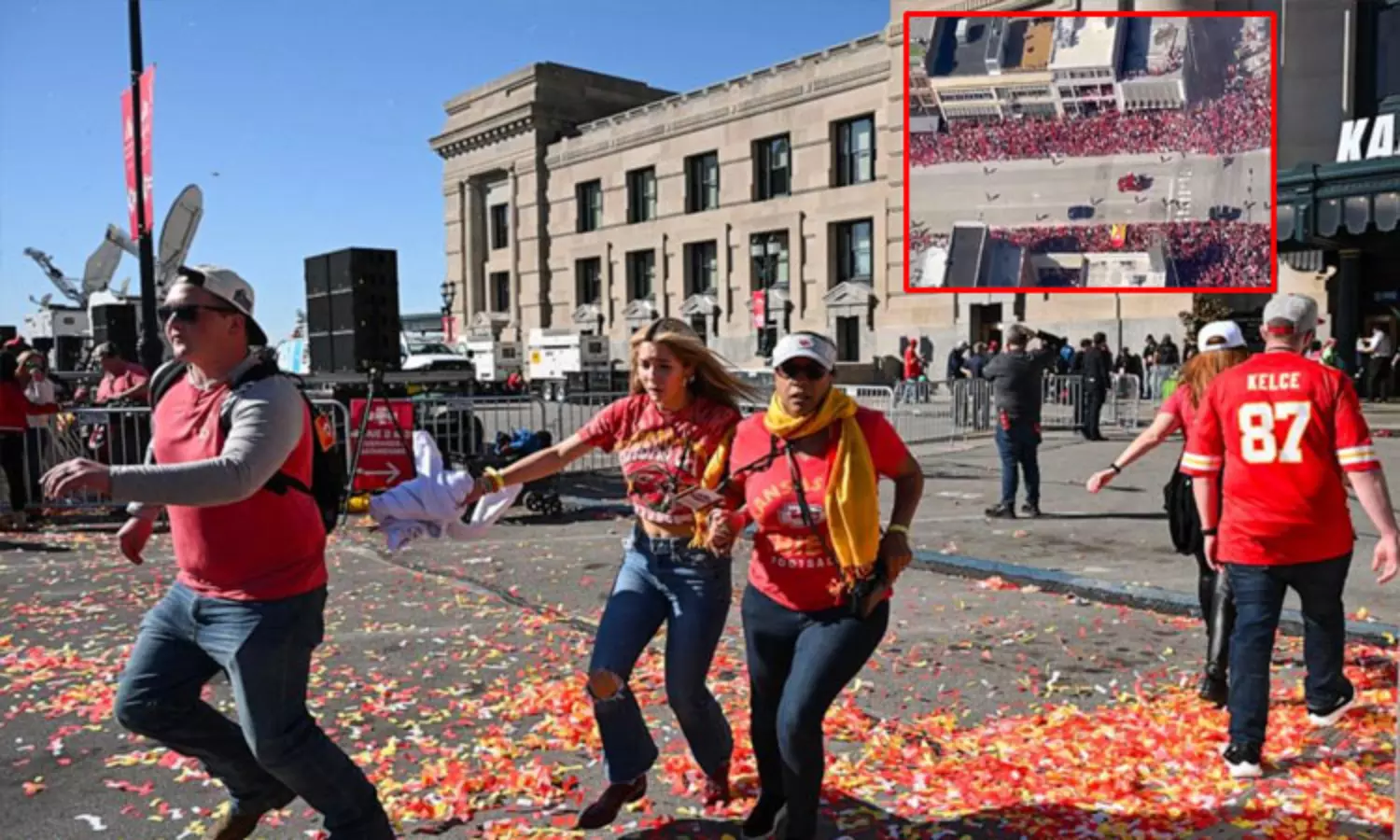 இந்த பேரணியில், ஆண்கள், பெண்கள் என ரசிகர்கள் ஆயிரக்கணக்கானோர் திரண்டனர். அப்போது, யூனியன் ஸ்டேசன் பகுதியில் பேரணி வந்தபோது, திடீரென கூட்டத்தில் துப்பாக்கி சூடு நடத்தப்பட்டு உள்ளது. இதனால், பேரணியில் திரண்டிருந்த பெண்கள் உள்ளிட்ட பலரும் அலறியடித்து ஓடினர்.