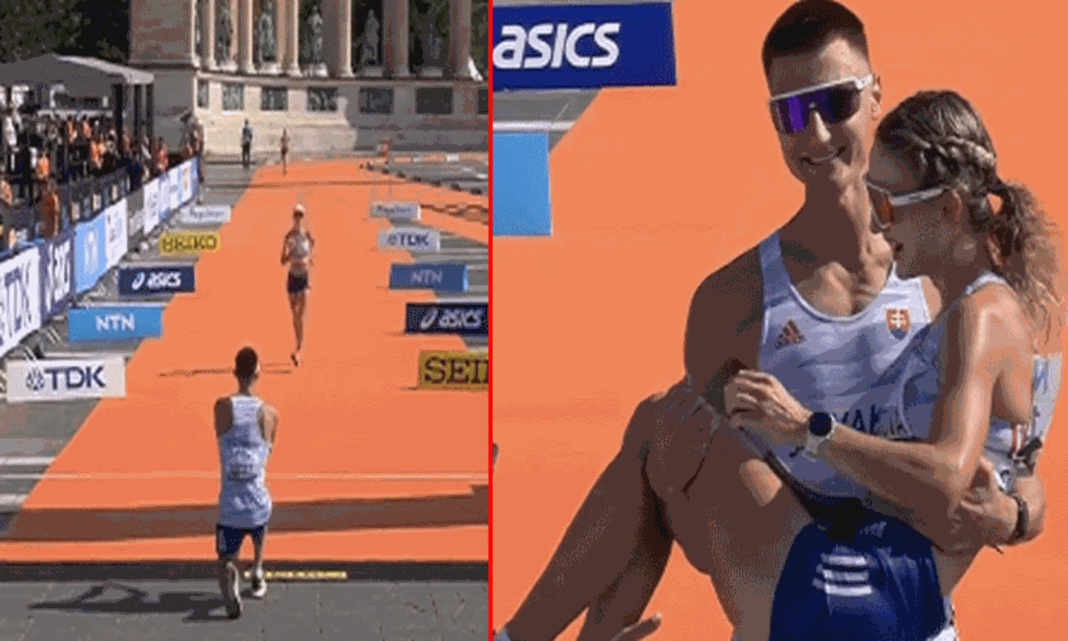 நடை போட்டியில் பந்தய தூரத்தை கடத்த ஸ்லோவாக்கிய வீராங்கனையிடம் சக நாட்டு தடகள வீரர் தனது காதலை வெளிப்படுத்தினார்.;