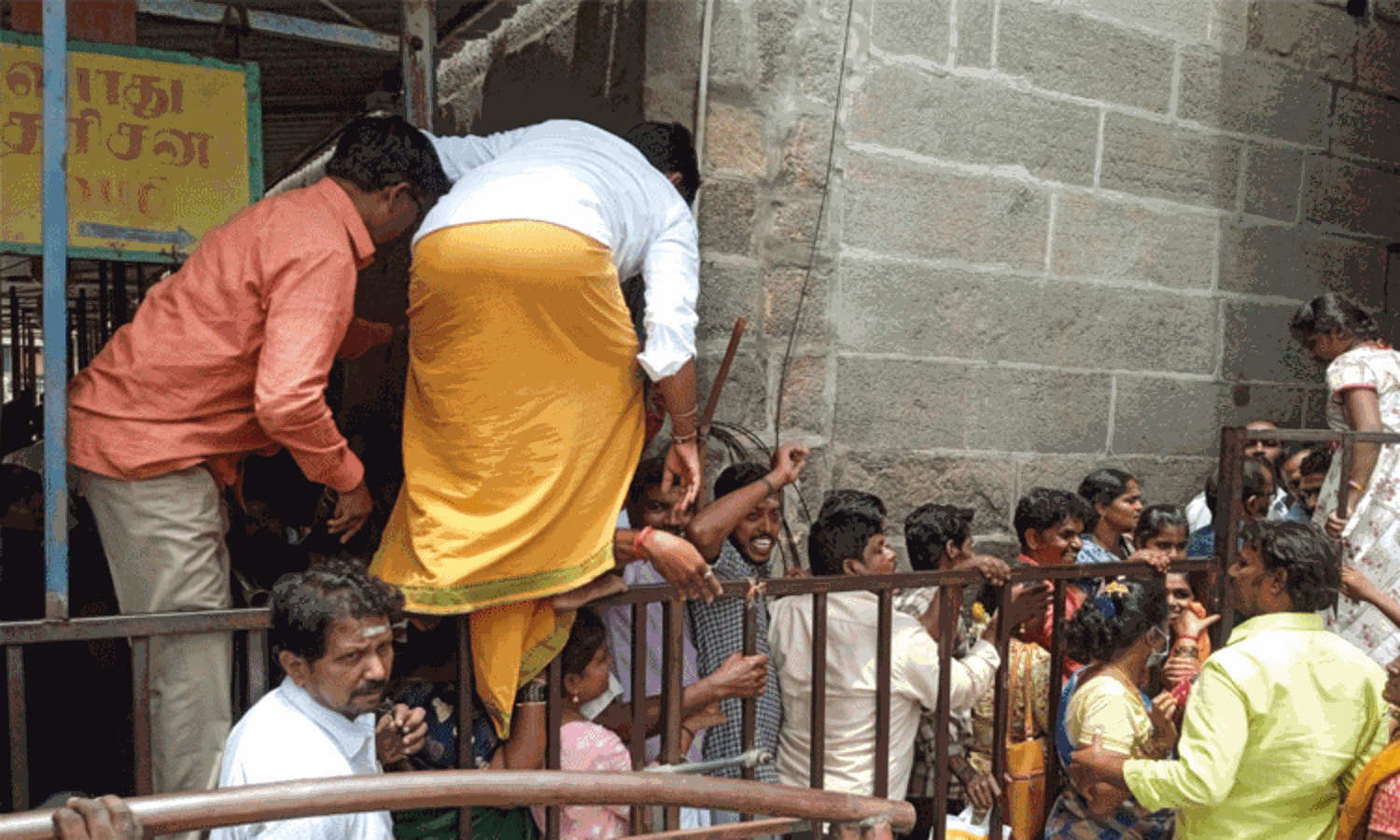 வரிசையில் காத்திருக்க முடியாமல் சிலர் இரும்பு தடுப்பு கம்பிகள் மேல் ஏறி இறங்கி சென்றனர்.