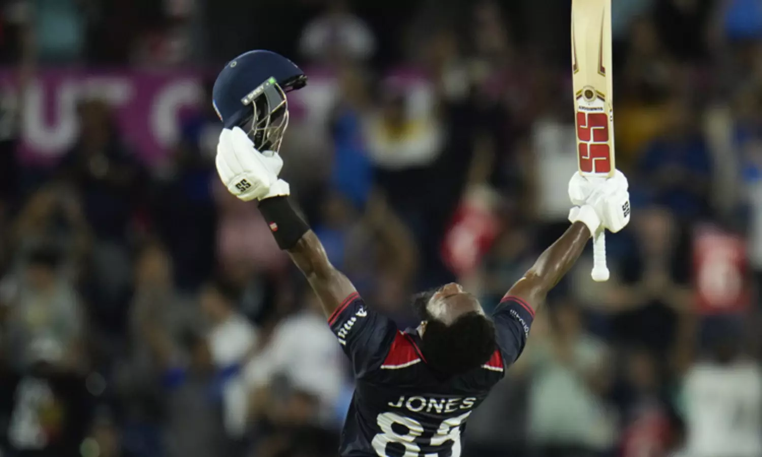 இதனையடுத்து 195 ரன்கள் அடித்தால் வெற்றி என்ற இலக்குடன் களமிறங்கிய அமெரிக்கா வெறும் 17.4 ஓவர்களிலேயே இலக்கை கடந்து 7 விக்கெட்டுகள் வித்தியாசத்தில் அபார வெற்றி பெற்றது. அந்த அணியில் அதிகபட்சமாக ஆரோன் ஜோன்ஸ் 10 சிக்சர்கள் உட்பட 94 ரன்கள் குவித்தார்.