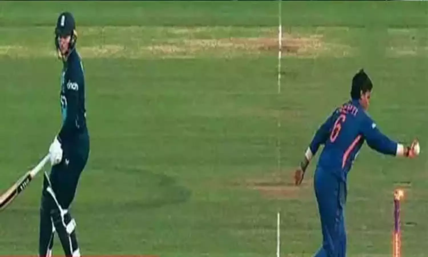 அதாவது சுழற்பந்து வீச்சாளர் தீப்தி சர்மா பந்தை வீசுவதற்கு முன்பே பவுலிங் முனையில் நின்ற சார்லி டீன் கிரீசை விட்டு சில அடிகள் முன்னோக்கி நகர்ந்தார். இதனை கவனித்த தீப்தி ஷர்மா பந்தை வீசாமல் ஸ்டம்பை பந்தால் அடித்து சார்லி டீனை ரன்-அவுட் செய்து இந்திய அணிக்கு வெற்றியை தேடித்தந்தார்.