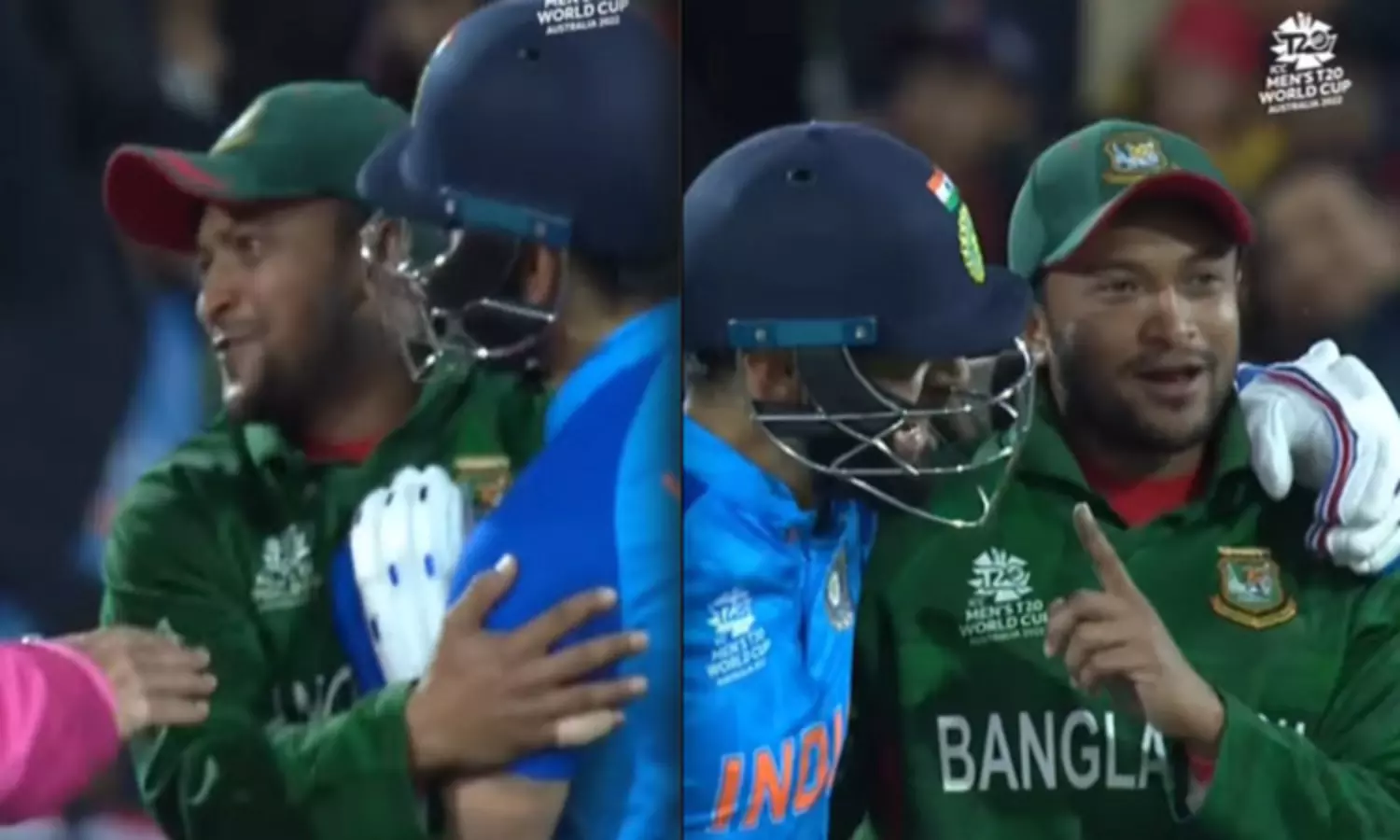 பின்னர் கோலி, சாகிப் தோள் மீது கை போட்டு புன்னகையுடன் எதோ கூற, இருவரும் சிரித்து கொண்டு முதுகில் தட்டி கொடுத்து சென்றனர். இது குறித்த வீடியோ தற்போது சமூக வலைத்தளங்களில் வைரலாகி வருகிறது.